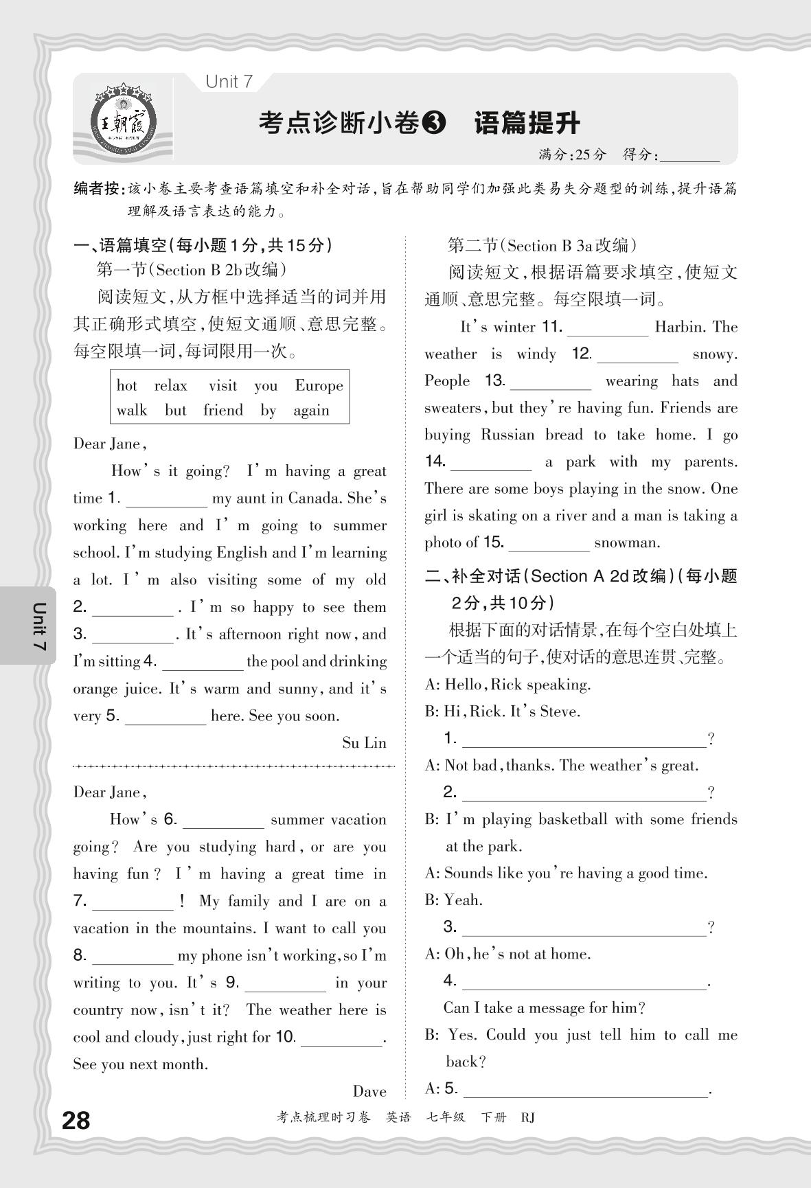 2024春下册七年级英语人教版 Unit 7 考点诊断小卷3 语篇提升_R240117171601293