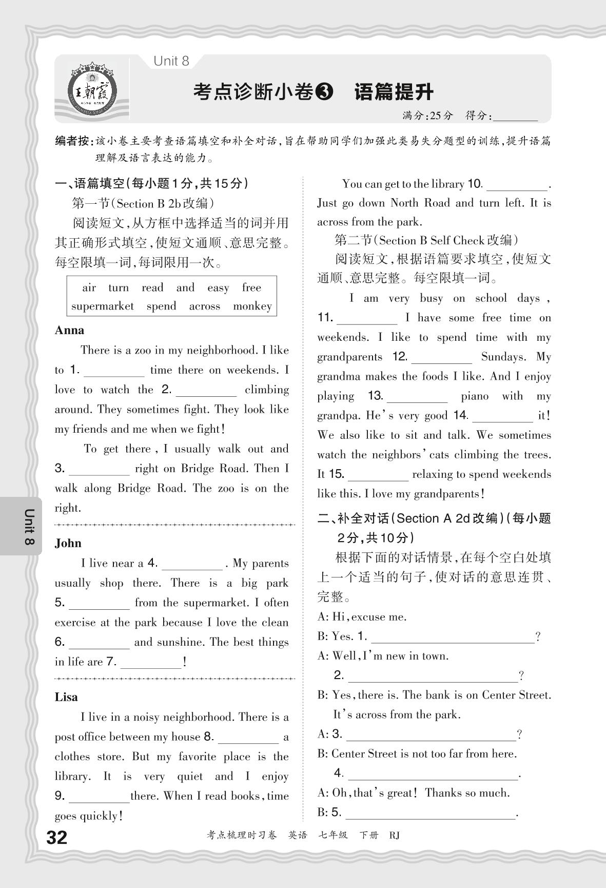 2024春下册七年级英语人教版 Unit 8 考点诊断小卷3 语篇提升_R240117171602604