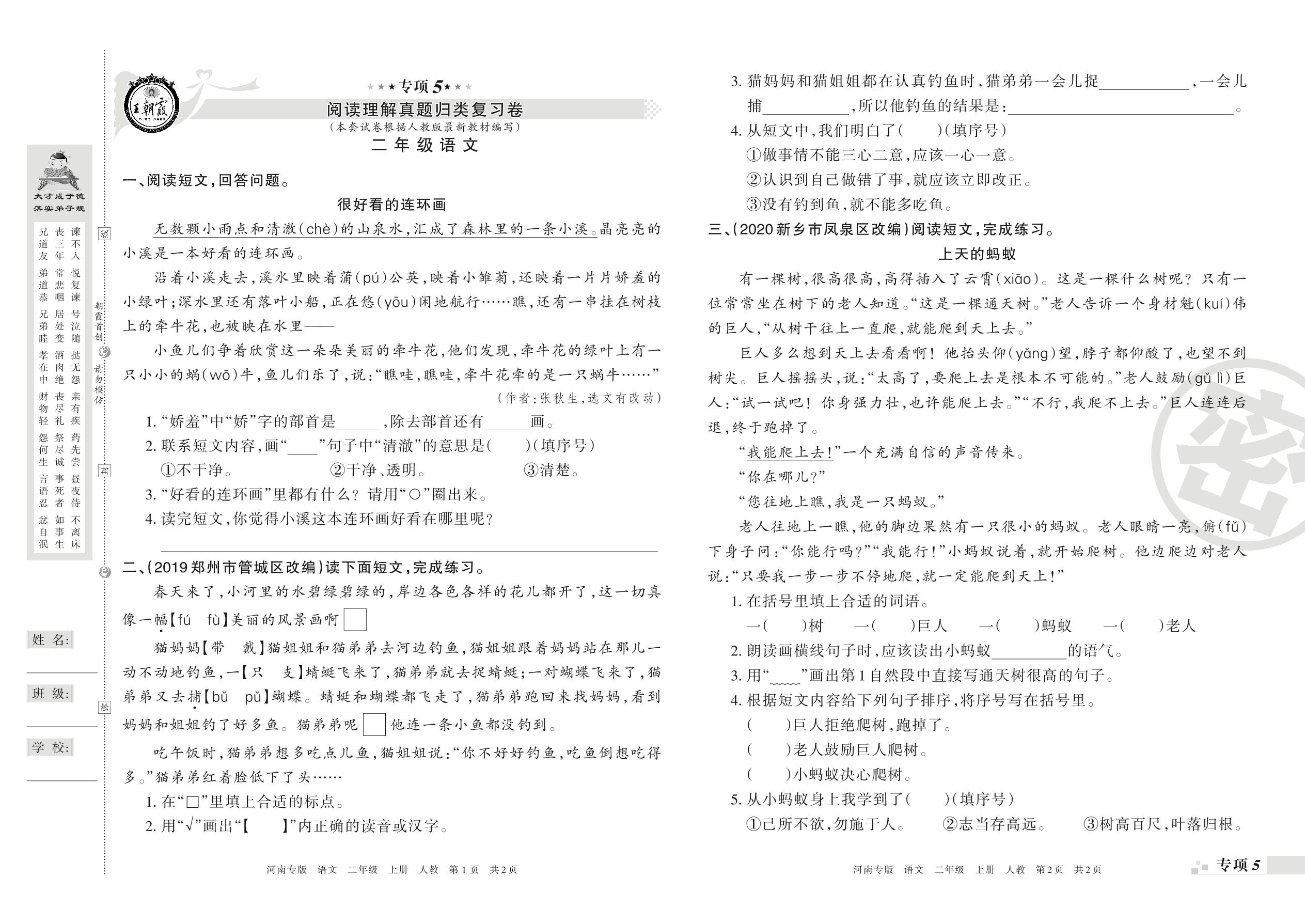 王朝霞期末专项卷——阅读理解、写话真题归类复习二年级上册语文(人教版)_R21080164357【0】