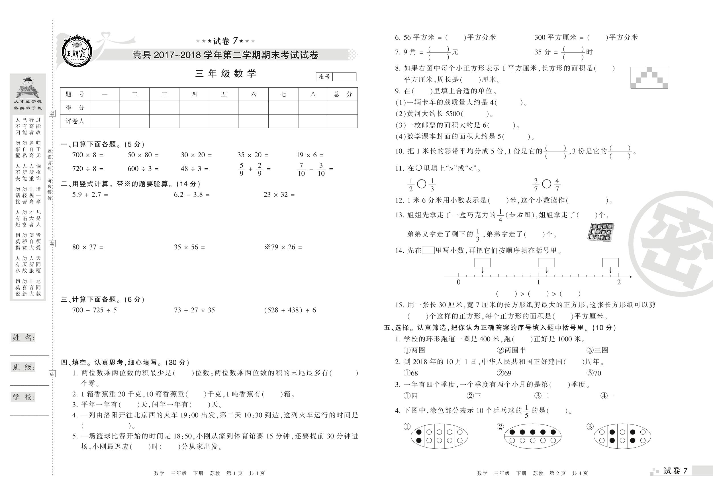 2017-2018学年第二学期洛阳市嵩县三年级数学试卷(苏教版)【7】