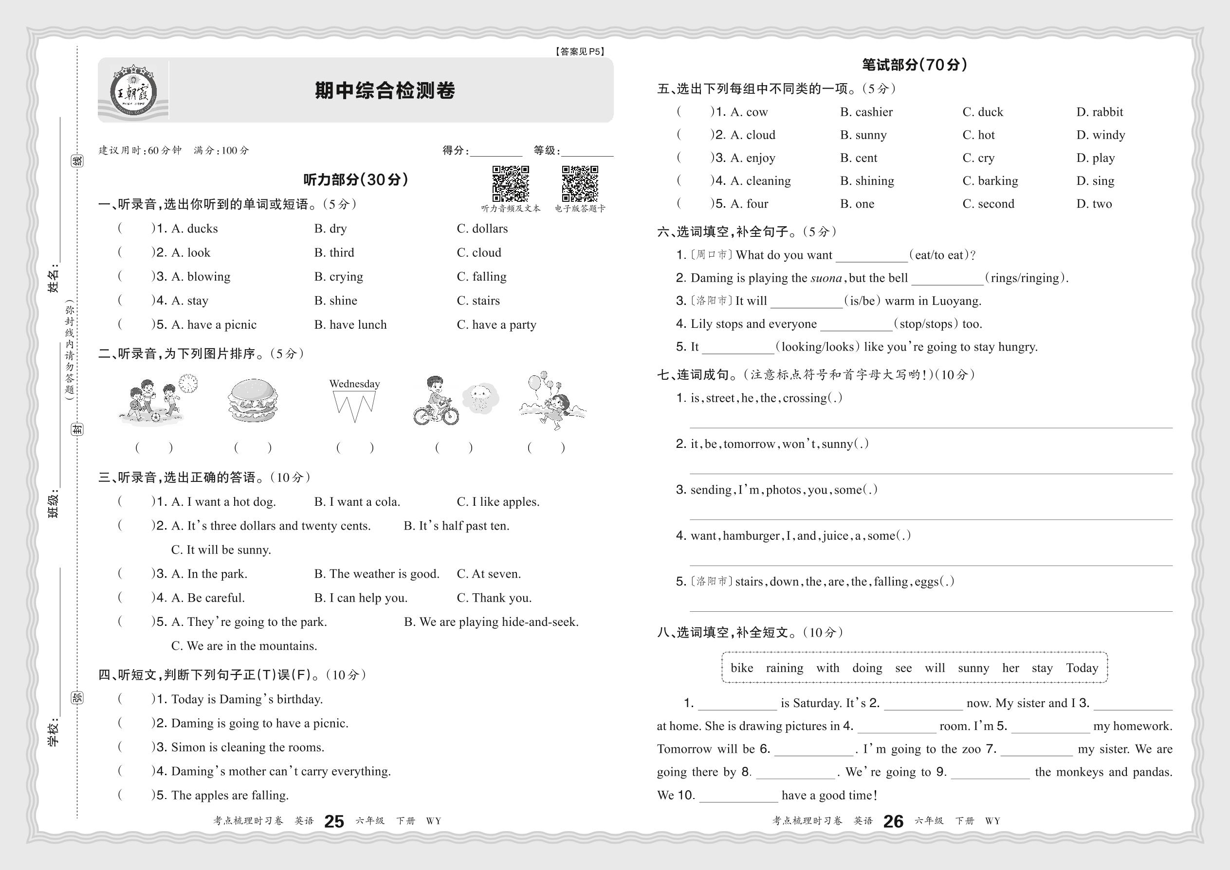 六年级英语外研版(三起始)下册期中卷