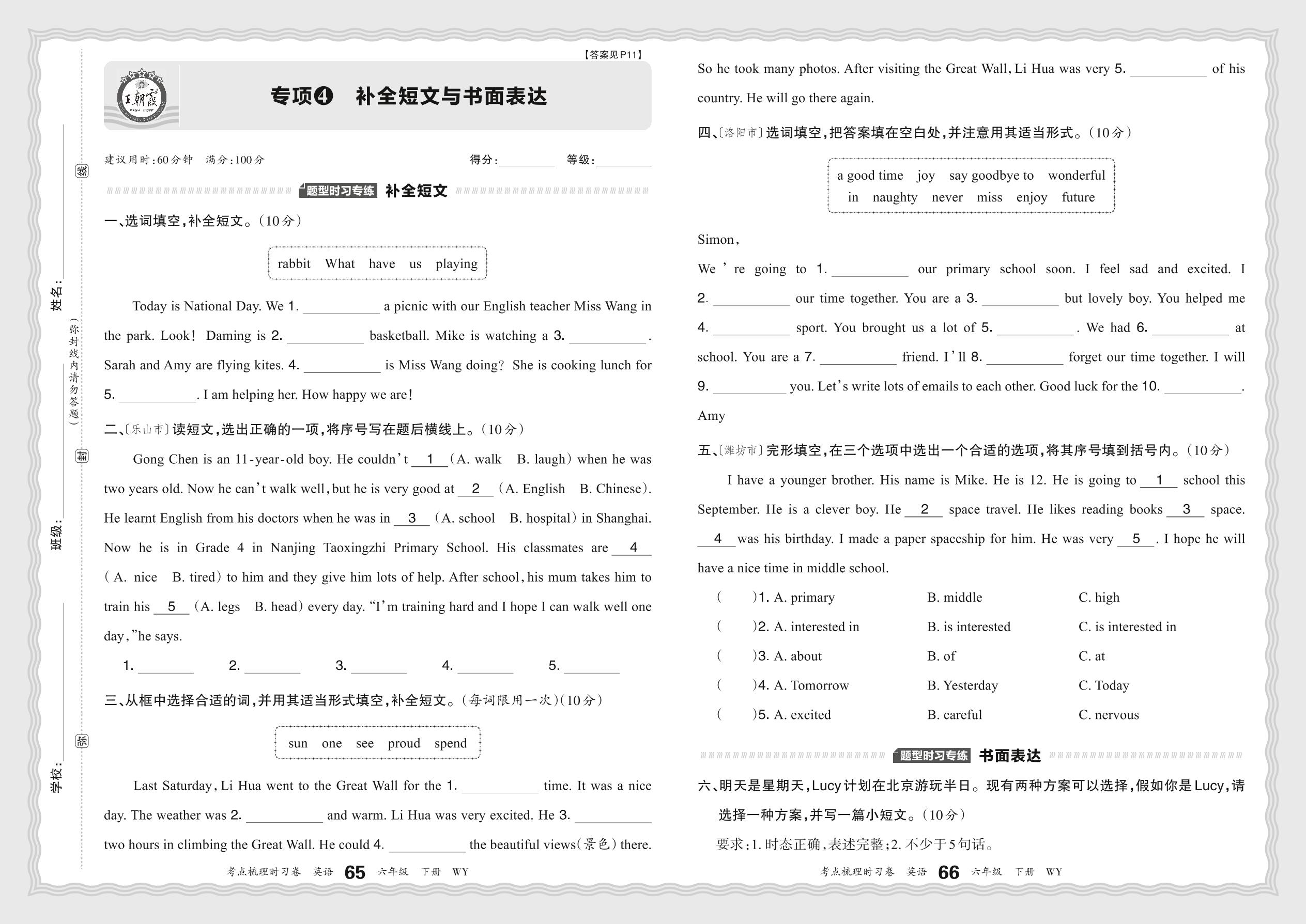 2024春下册六年级英语外研版 期末专项卷KD版·补全短文与书面表达【4】