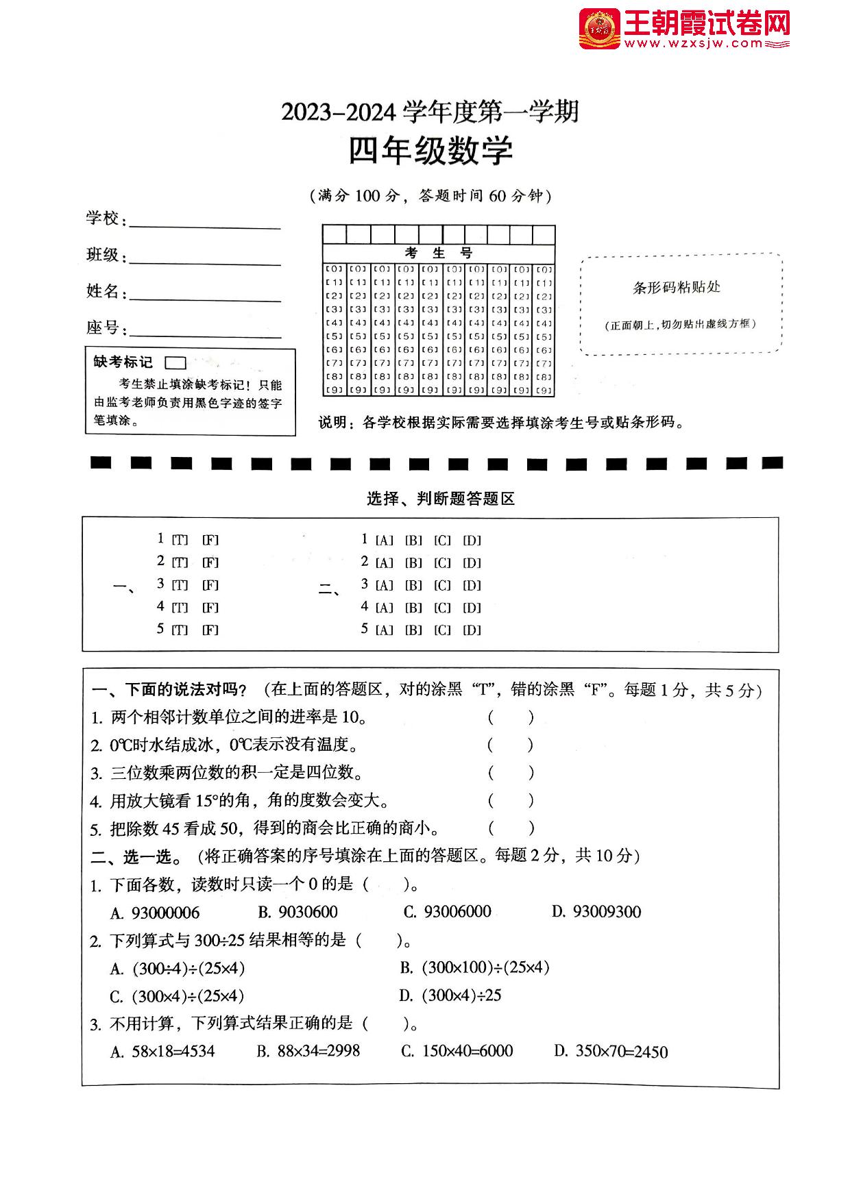广东省韶关市2023-2024学年度第一学期全市义务教育质量学业水平监测期末试卷四年级数学(北师版)