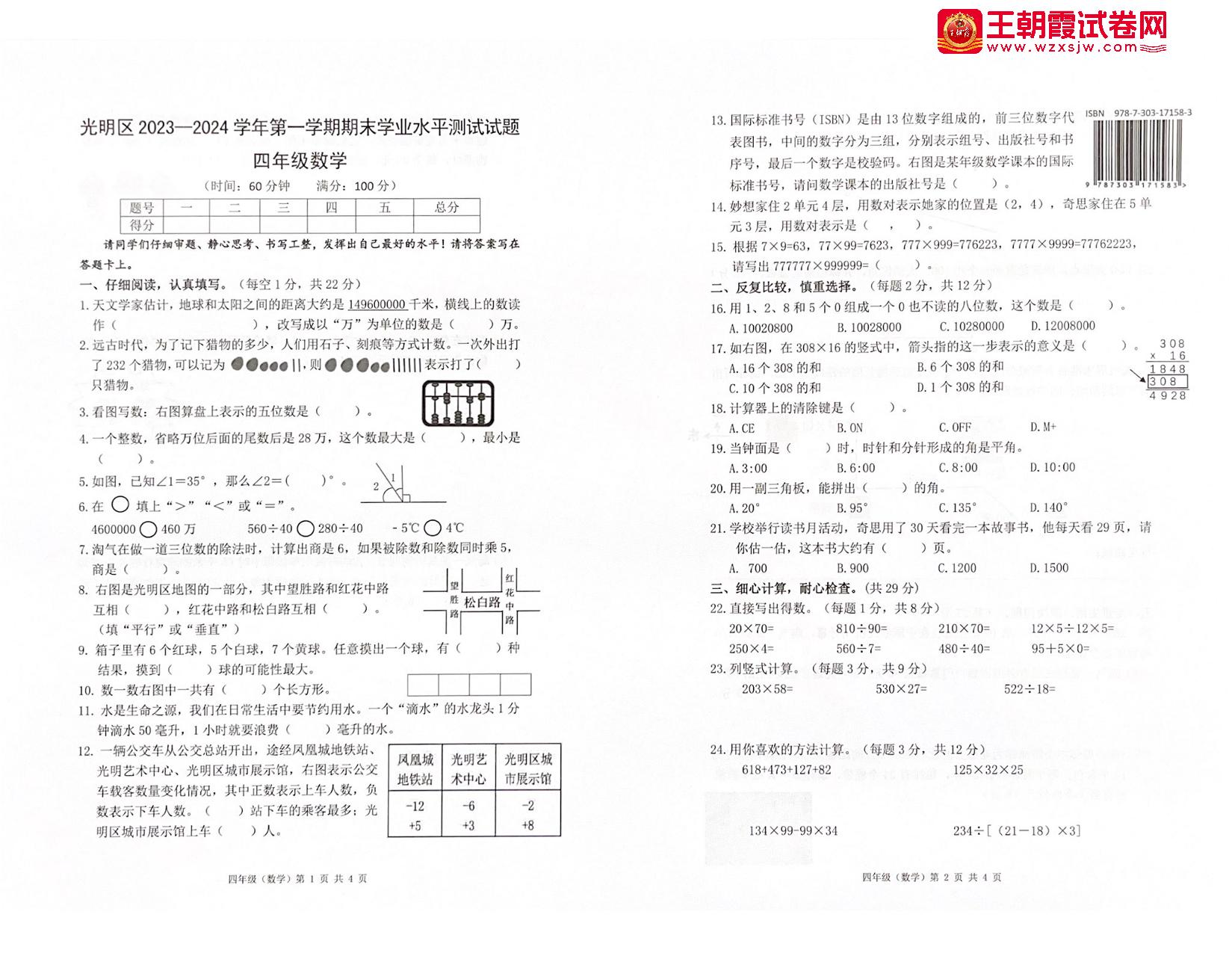 广东省深圳市光明区2023-2024学年第一学期期末学业水平测试试题四年级数学(北师版)