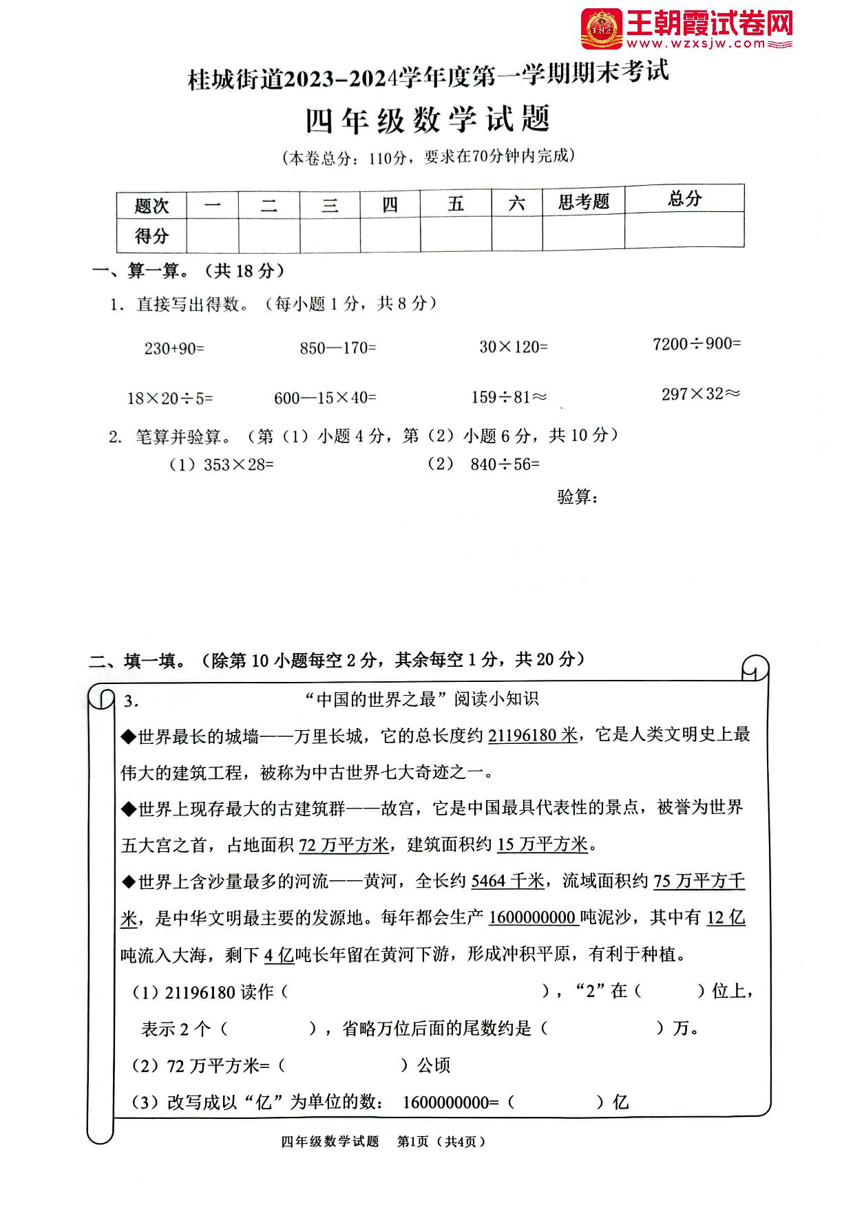 广东省佛山市南海区桂城街道2023-2024年度第一学期期末考试试题四年级数学(人教版)