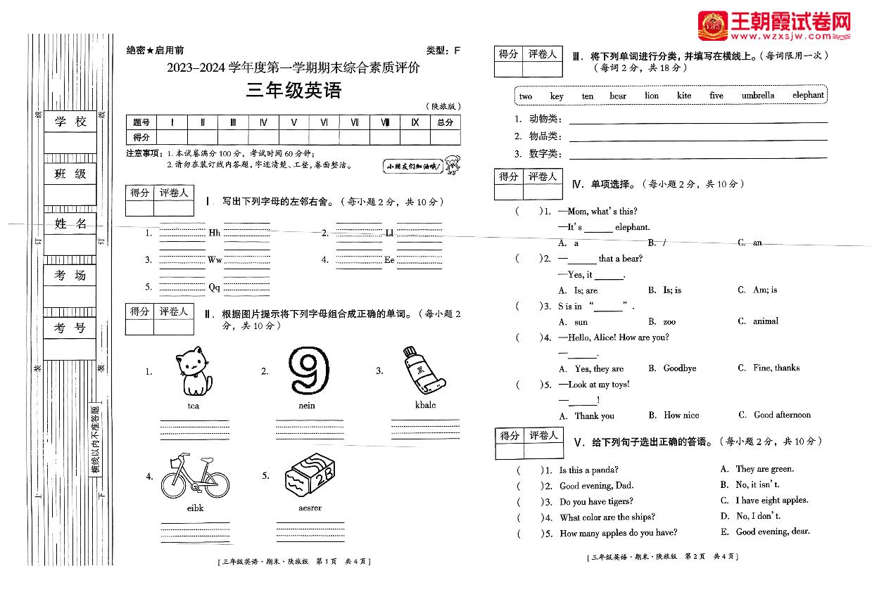 陕西省延安市富县2023-2024学年度第一学期期末综合素质评价试卷三年级英语(陕旅版)【无听力音频】