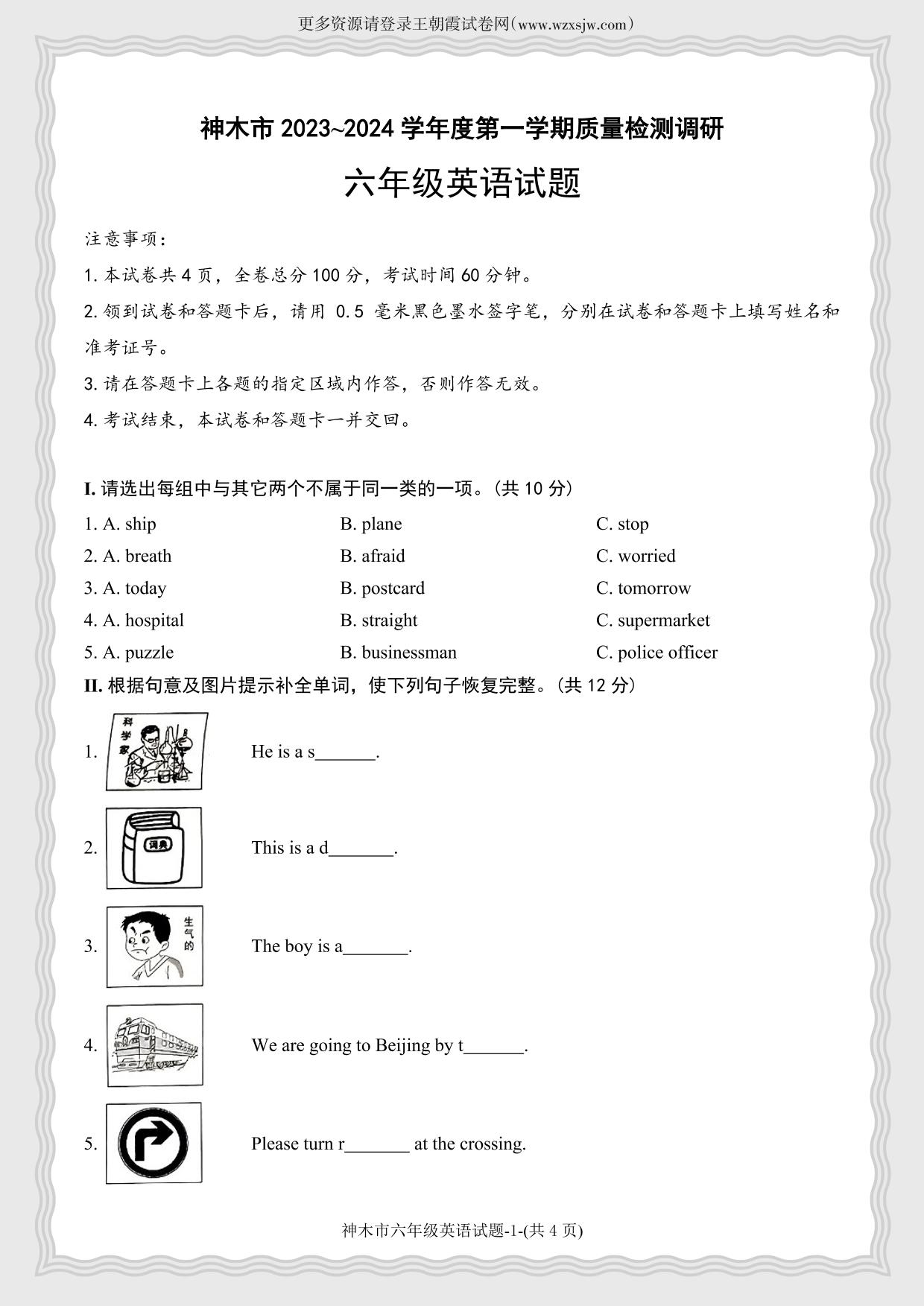 陕西省榆林市神木市2023-2024学年度第一学期期末质量检测调研试题六年级英语(人教PEP版)【无听力音频】