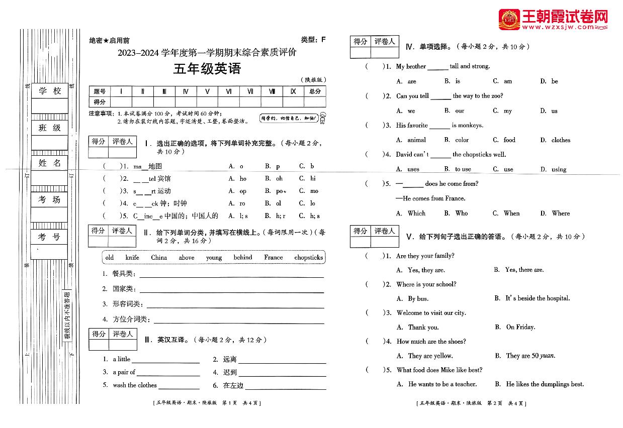 陕西省延安市富县2023-2024学年度第一学期期末综合素质评价试卷五年级英语(陕旅版)【无听力音频】