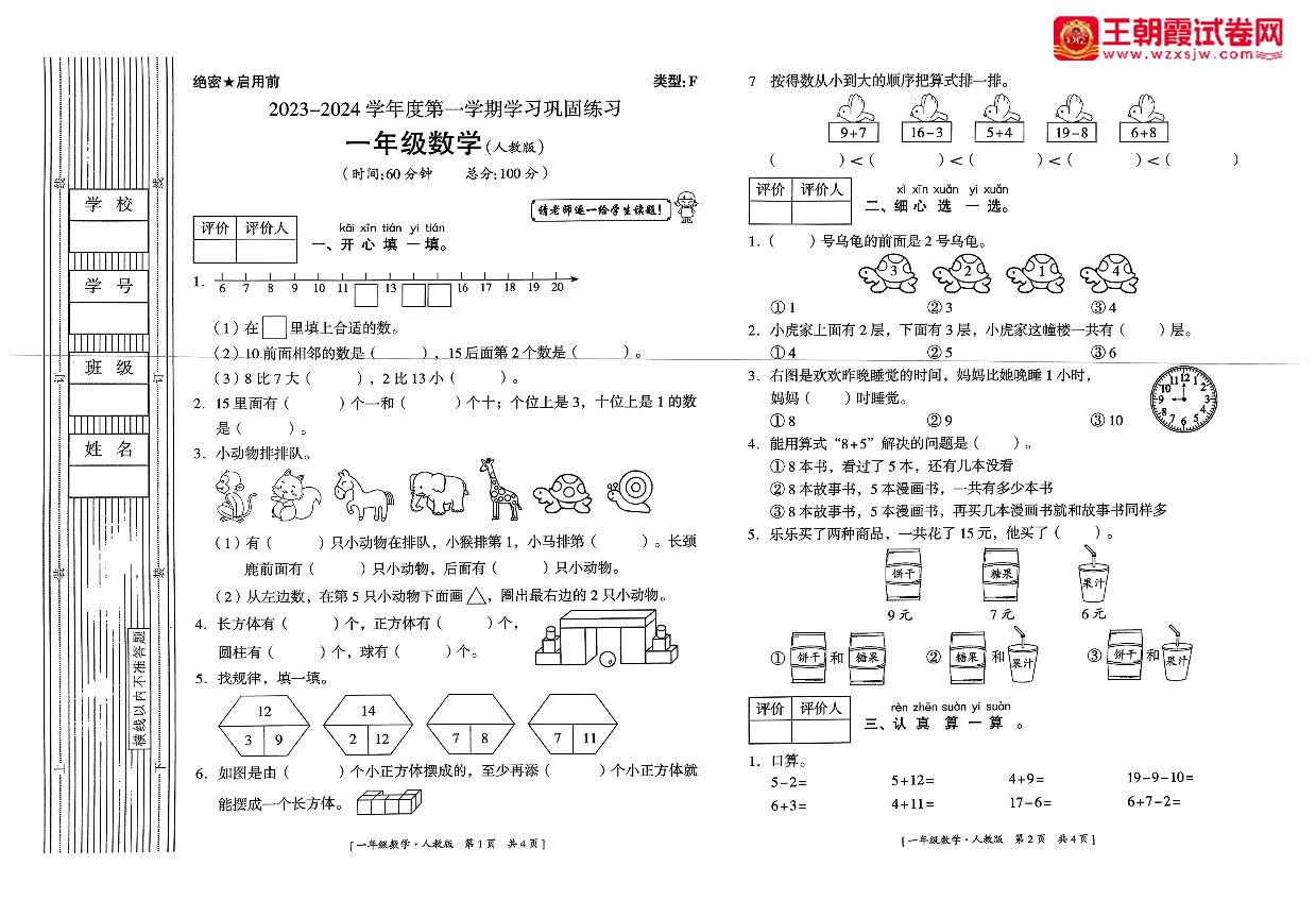 陕西省延安市富县2023-2024学年度第一学期期末学习巩固练习试卷一年级数学(人教版)