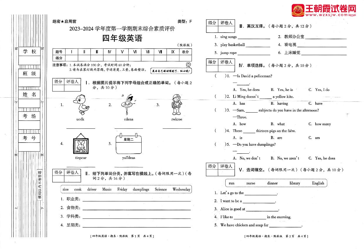 陕西省延安市富县2023-2024学年度第一学期期末综合素质评价试卷四年级英语(陕旅版)【无听力音频】