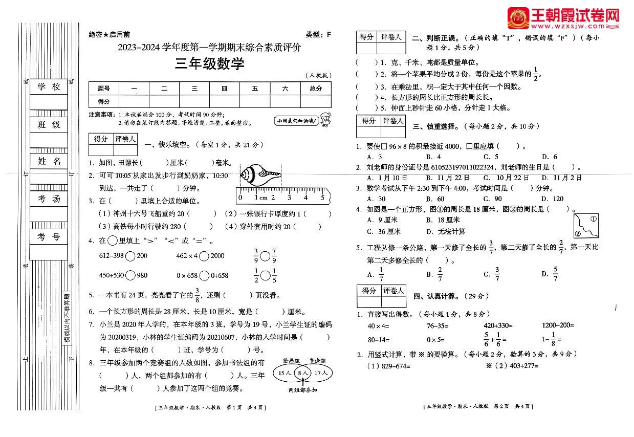 陕西省延安市富县2023-2024学年度第一学期期末综合素质评价试卷三年级数学(人教版)
