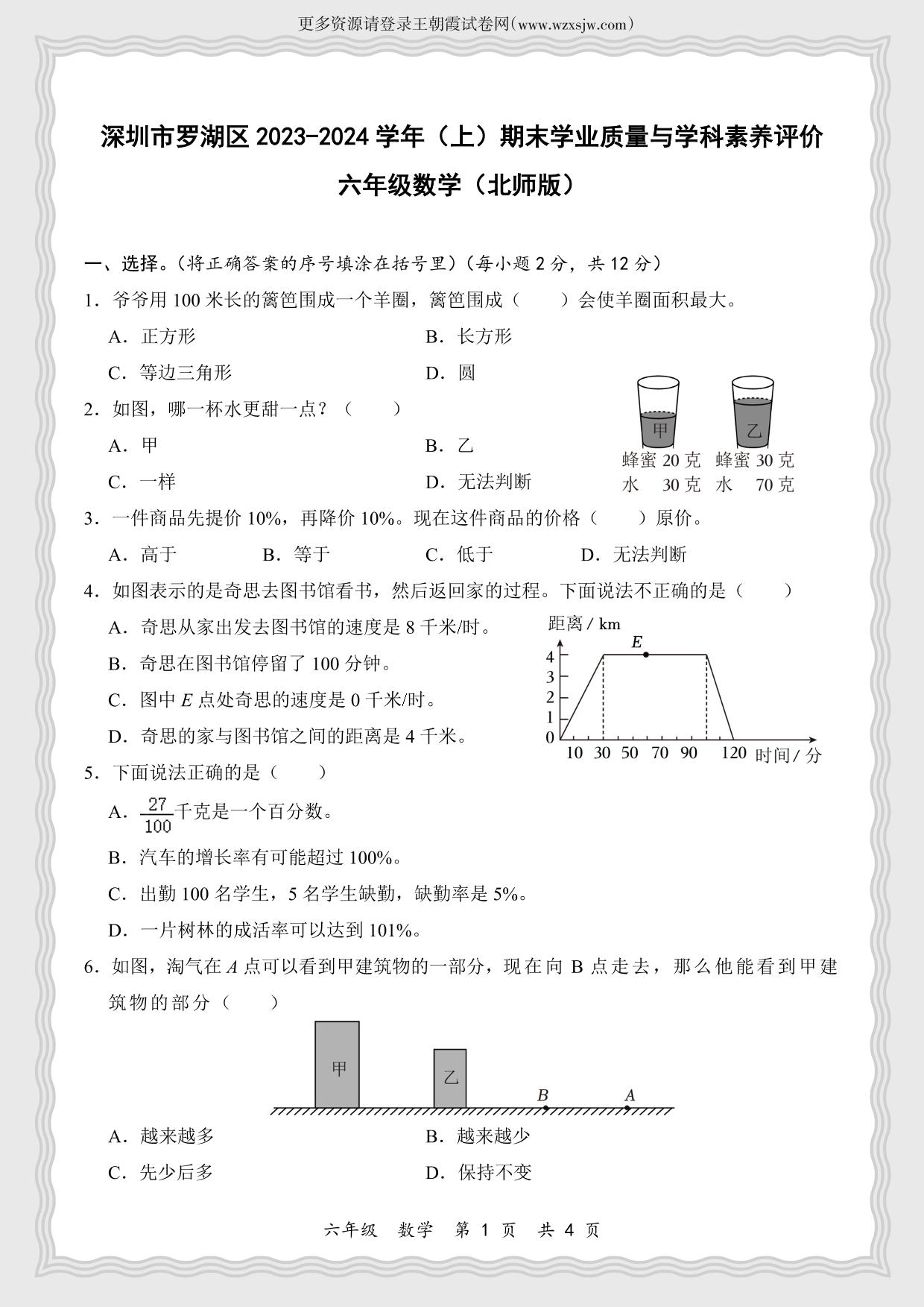 广东省深圳市罗湖区2023-2024学年(上)期末学业质量与学科素养评价试题六年级数学(北师版)