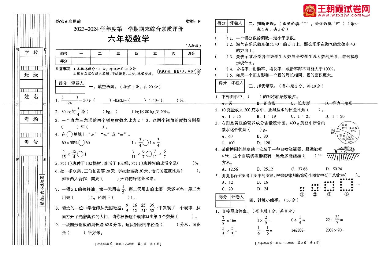陕西省延安市富县2023-2024学年度第一学期期末综合素质评价试卷六年级数学(人教版)