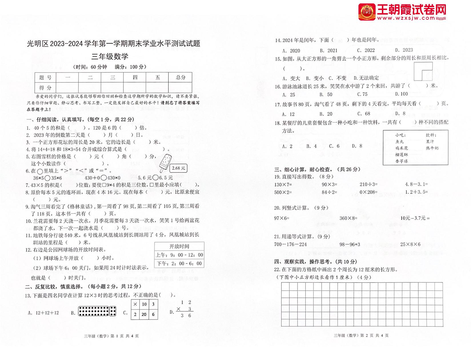 广东省深圳市光明区2023-2024学年第一学期期末学业水平测试试题三年级数学(北师版)