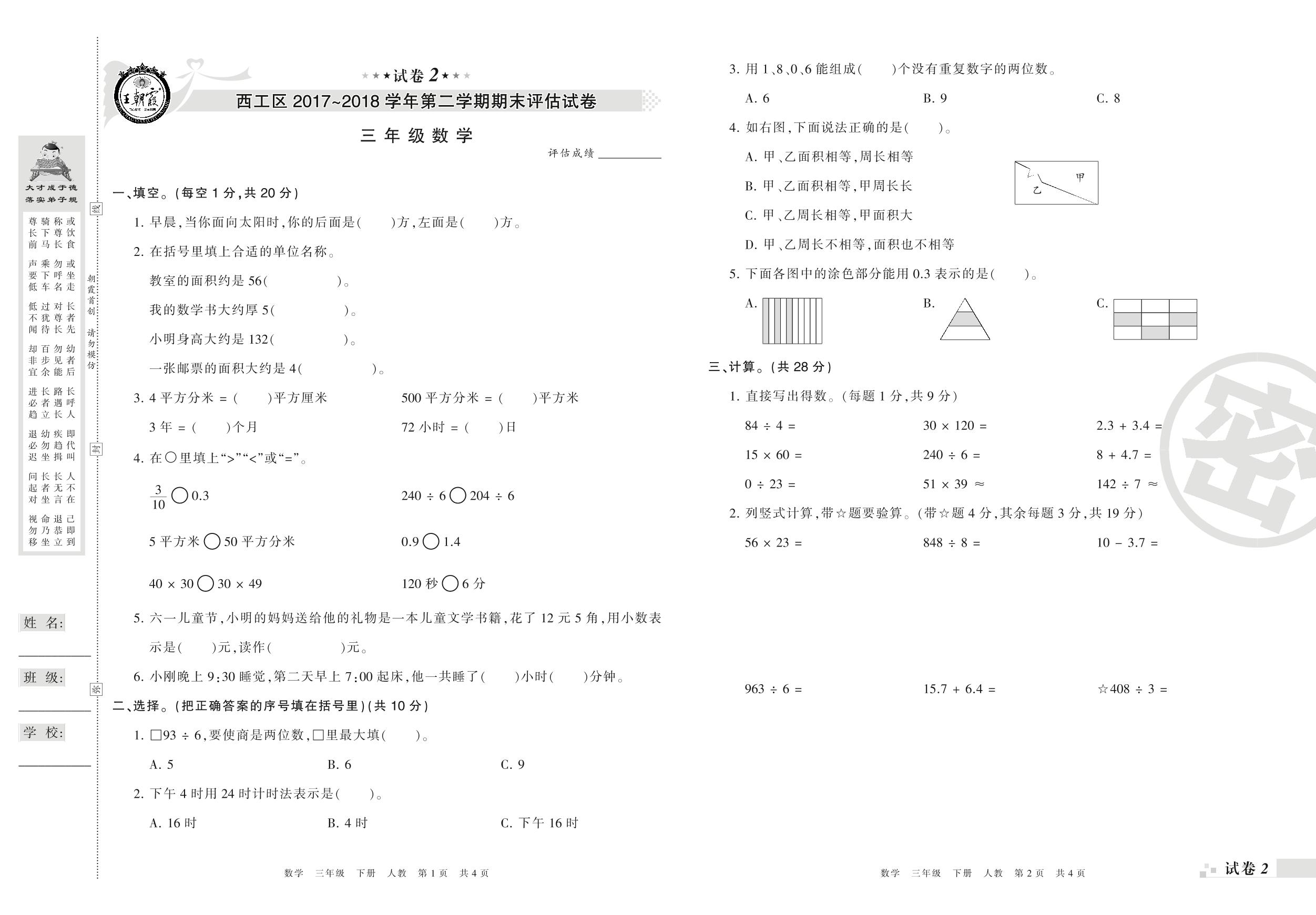 2017-2018学年第二学期洛阳市西工区三年级数学试卷(人教版)【2】