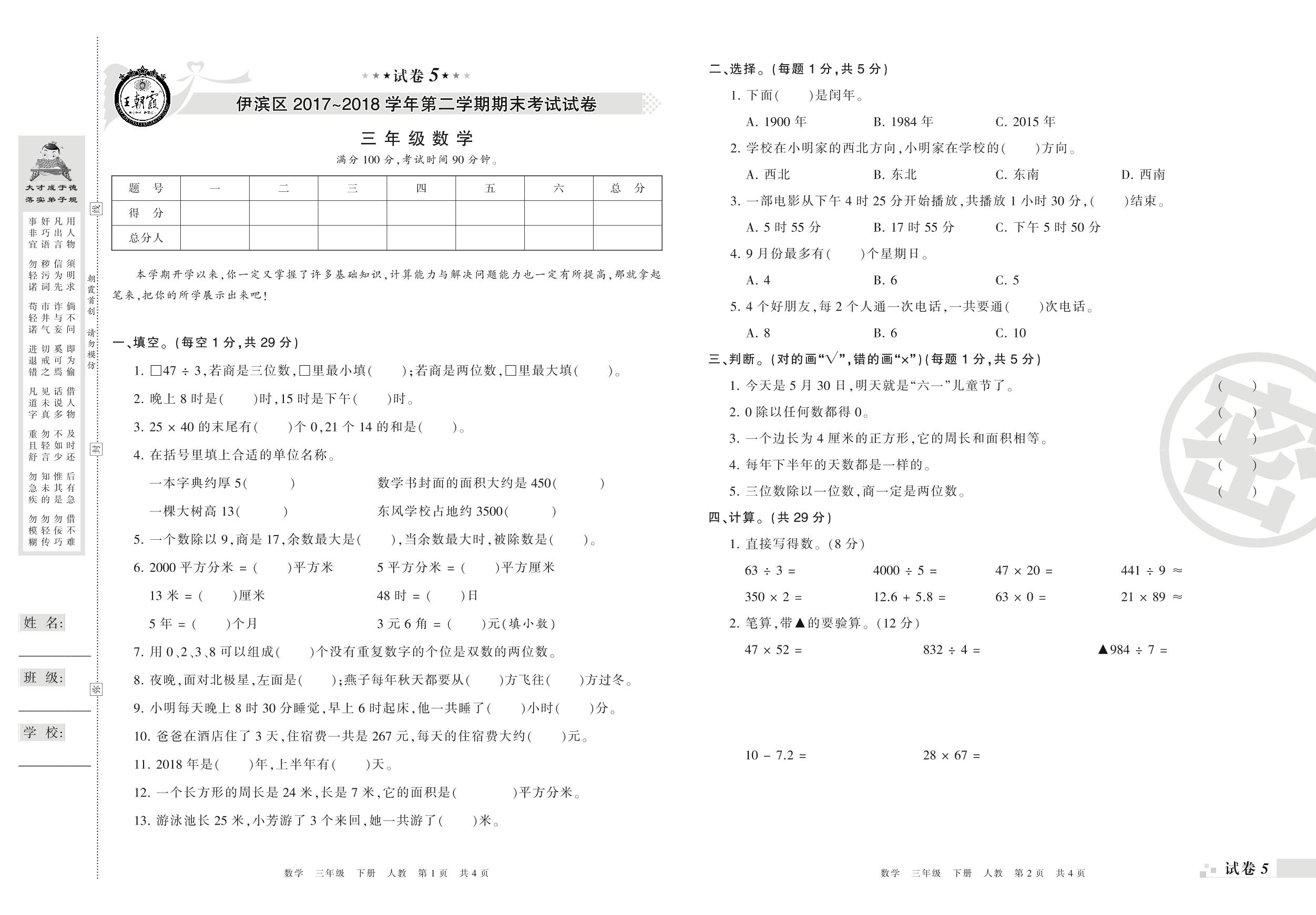 2017-2018学年第二学期洛阳市伊滨区三年级数学试卷(人教版)【5】