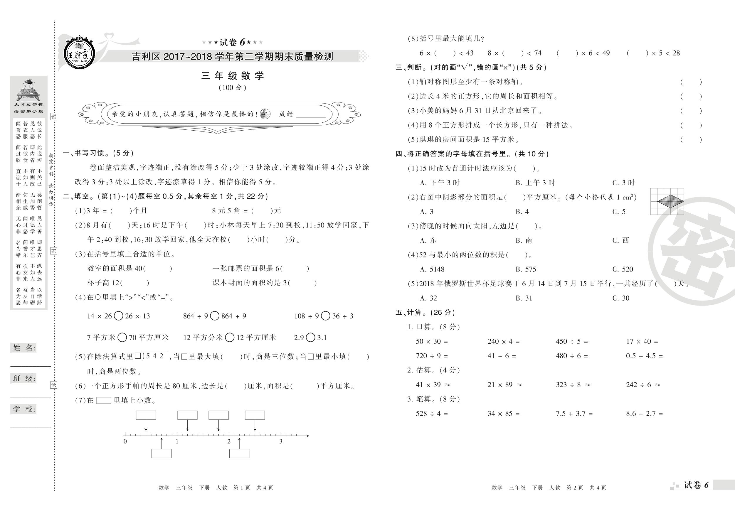 2017-2018学年第二学期洛阳市吉利区三年级数学试卷(人教版)【6】