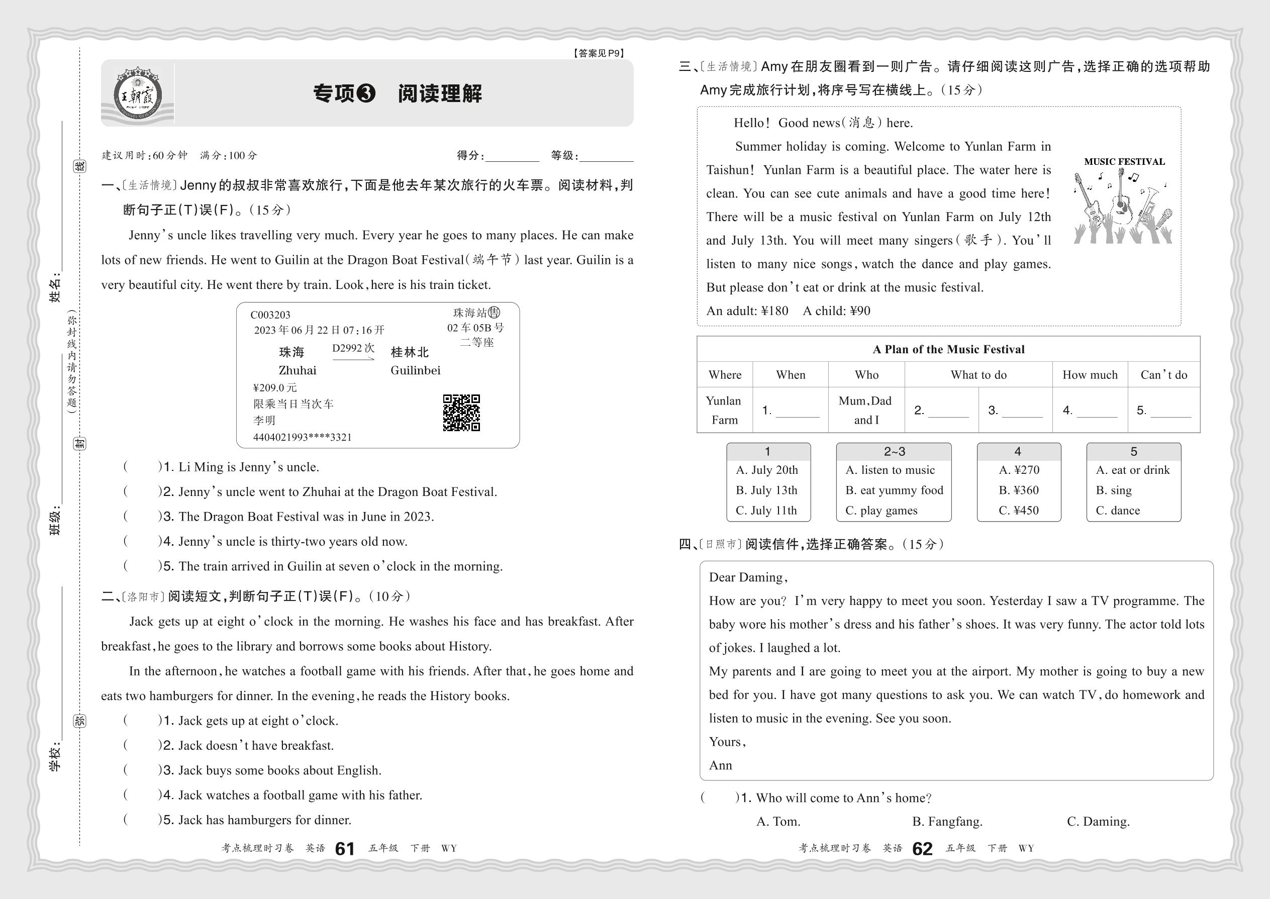 2024春下册五年级英语外研版 期末专项卷KD版·阅读理解【3】