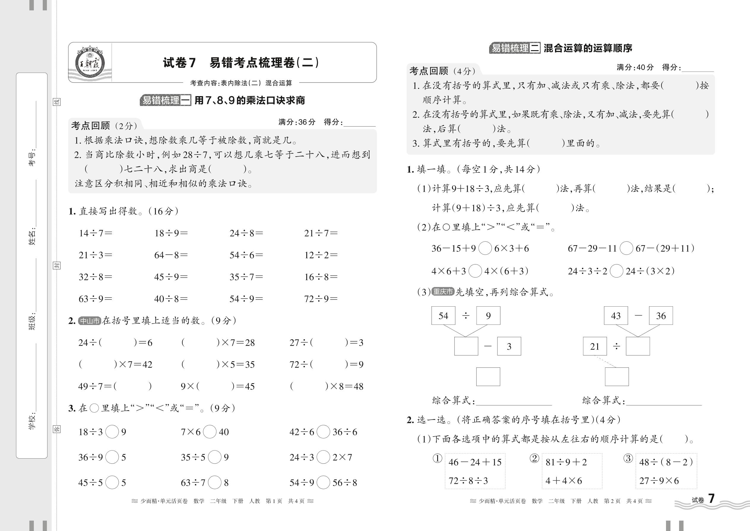 2024春下册二年级数学人教版 易错考点梳理卷——表内除法(二) 混合运算【7】