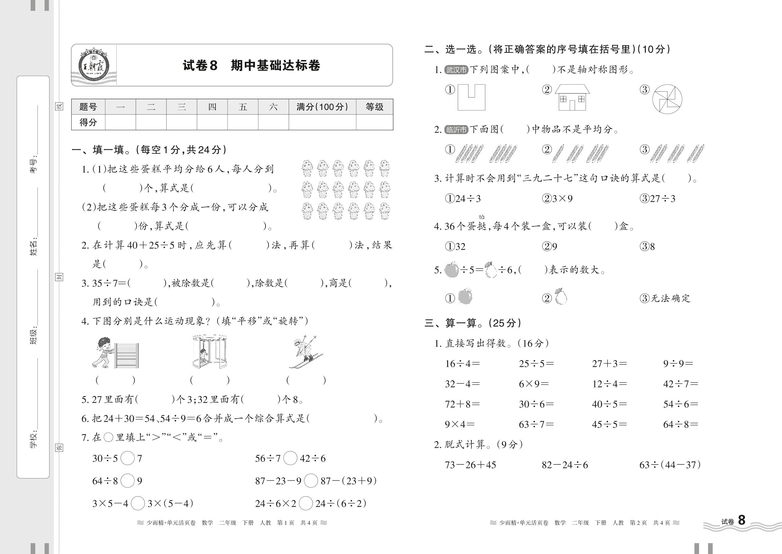 2024春下册二年级数学人教版 期中基础达标卷【8】