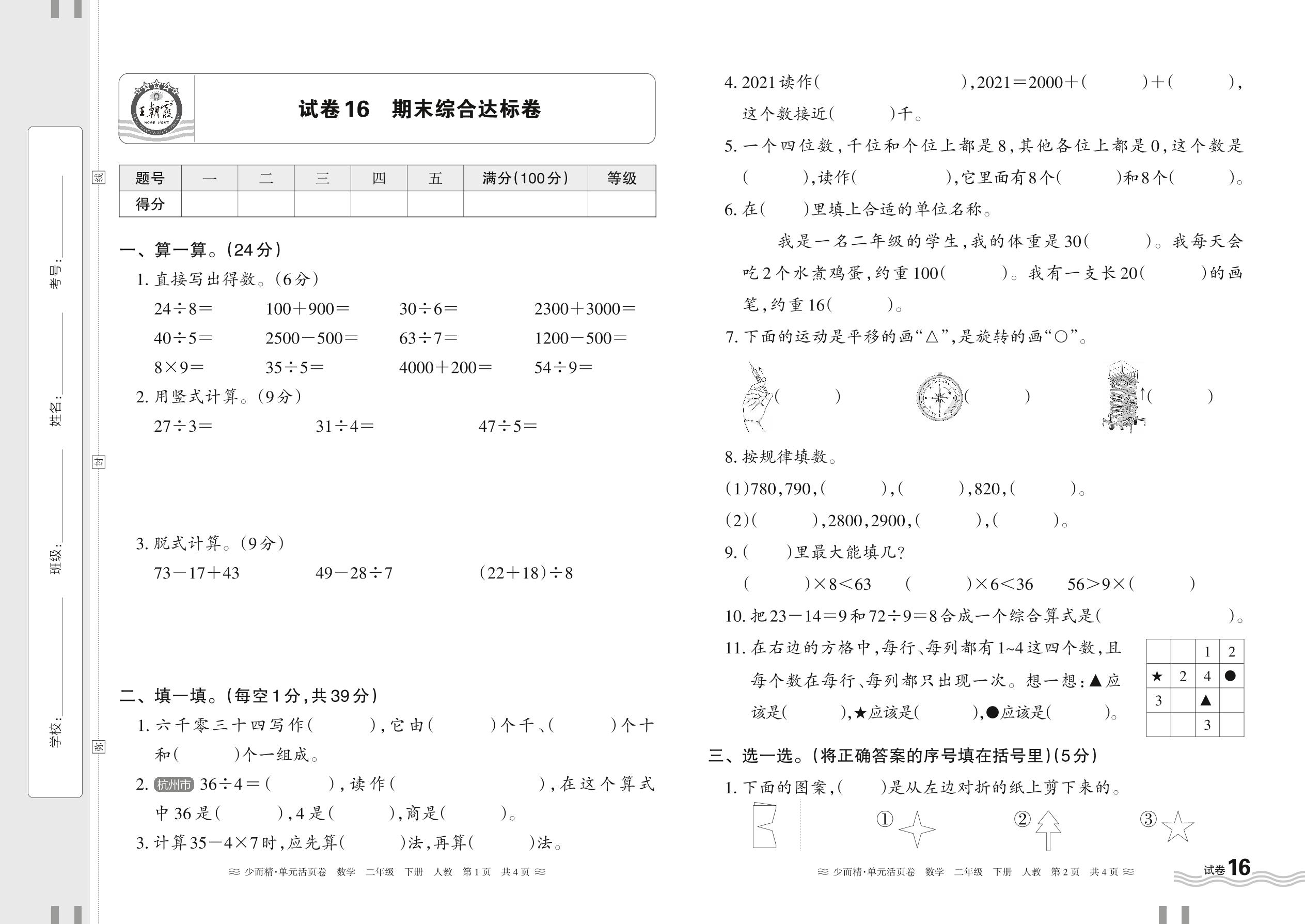 2024春下册二年级数学人教版 期末综合达标卷【16】