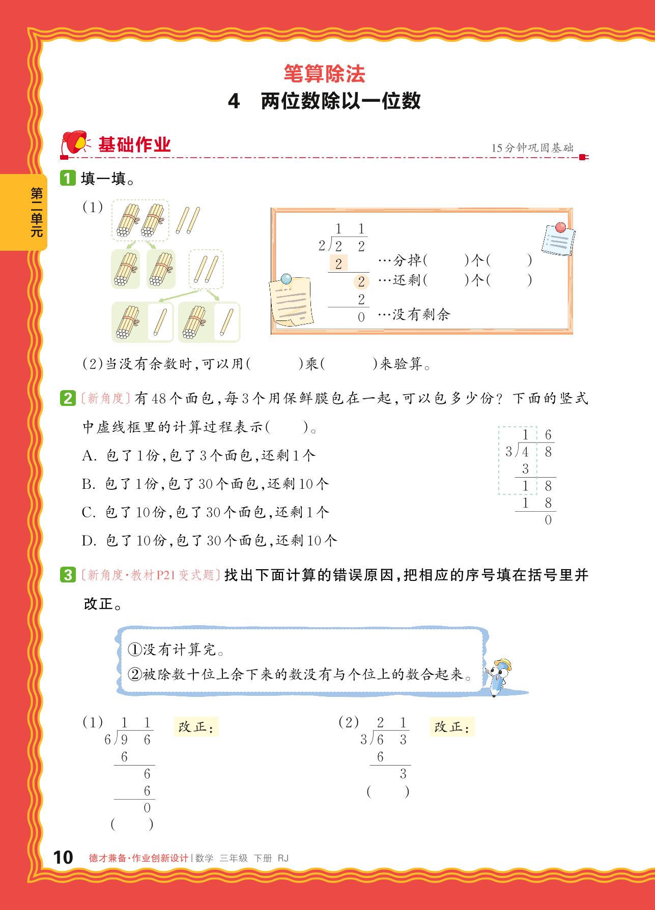 2024春下册三年级数学人教版 第二单元 除数是一位数的除法——4. 两位数除以一位数