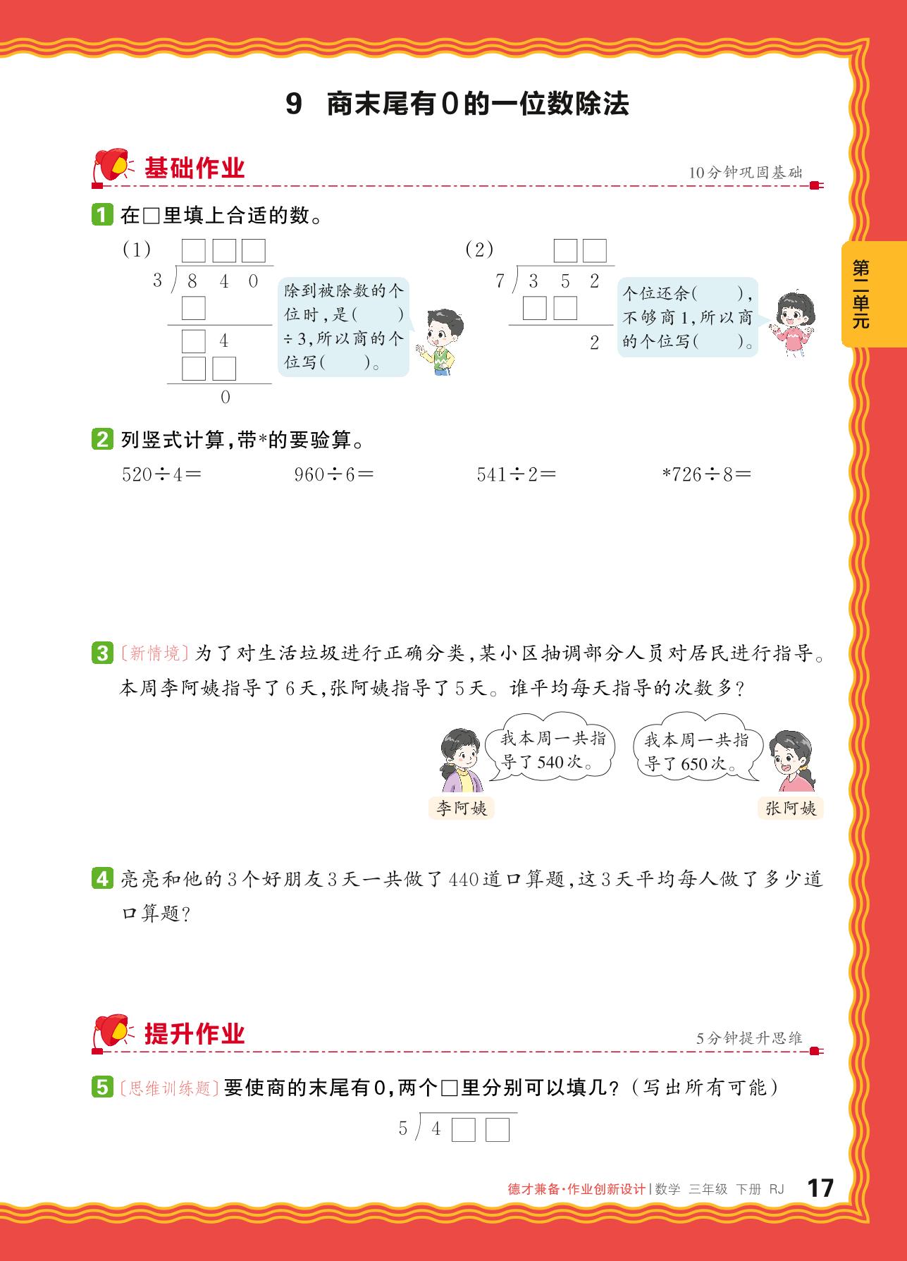 2024春下册三年级数学人教版 第二单元 除数是一位数的除法——9. 商末尾有0的一位数除法