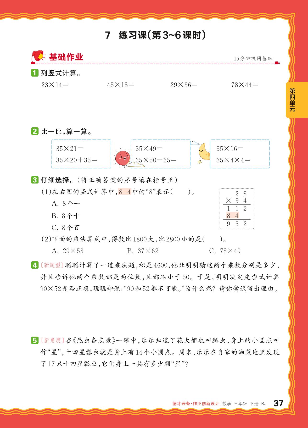2024春下册三年级数学人教版 第四单元 两位数乘两位数——7. 不进位乘法、进位乘法练习课