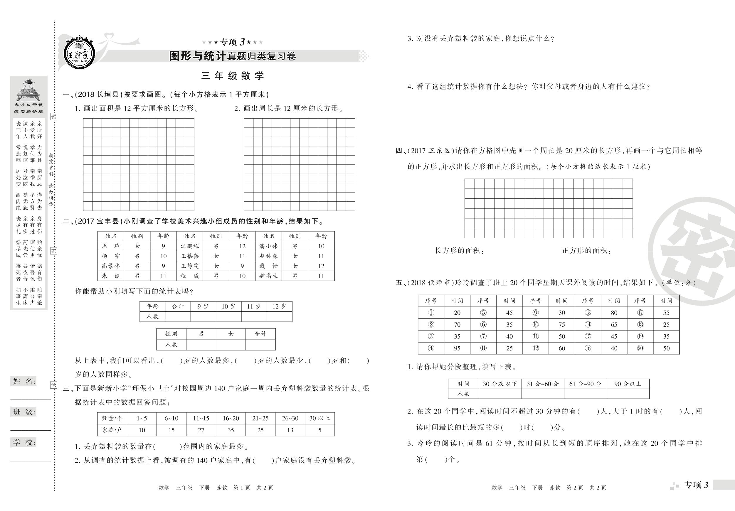 王朝霞期末专项卷——图形与统计、解决问题真题归类复习卷三年级下册数学(苏教版)_R21080495013【0】