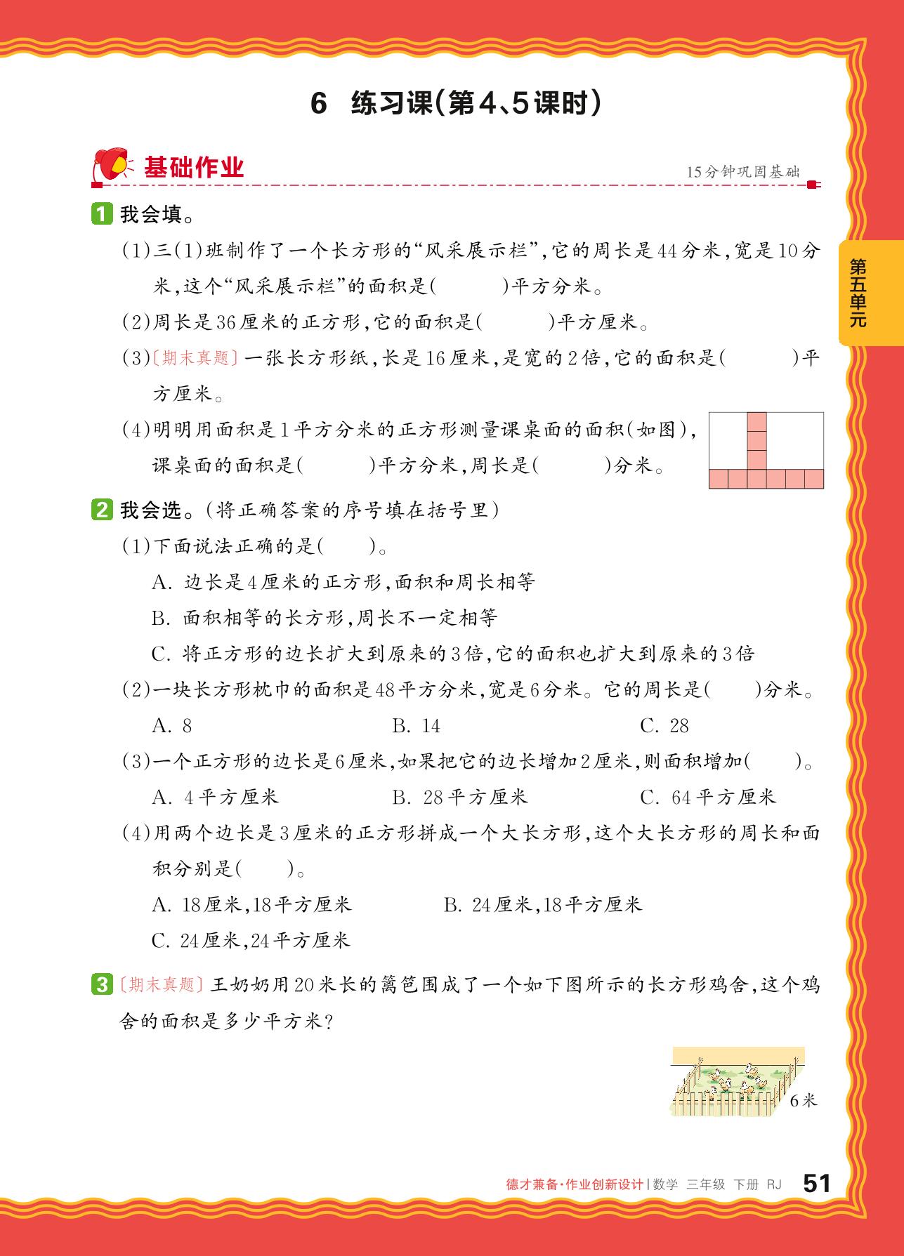 2024春下册三年级数学人教版 第五单元 面积——6. 长方形、正方形面积的计算练习课