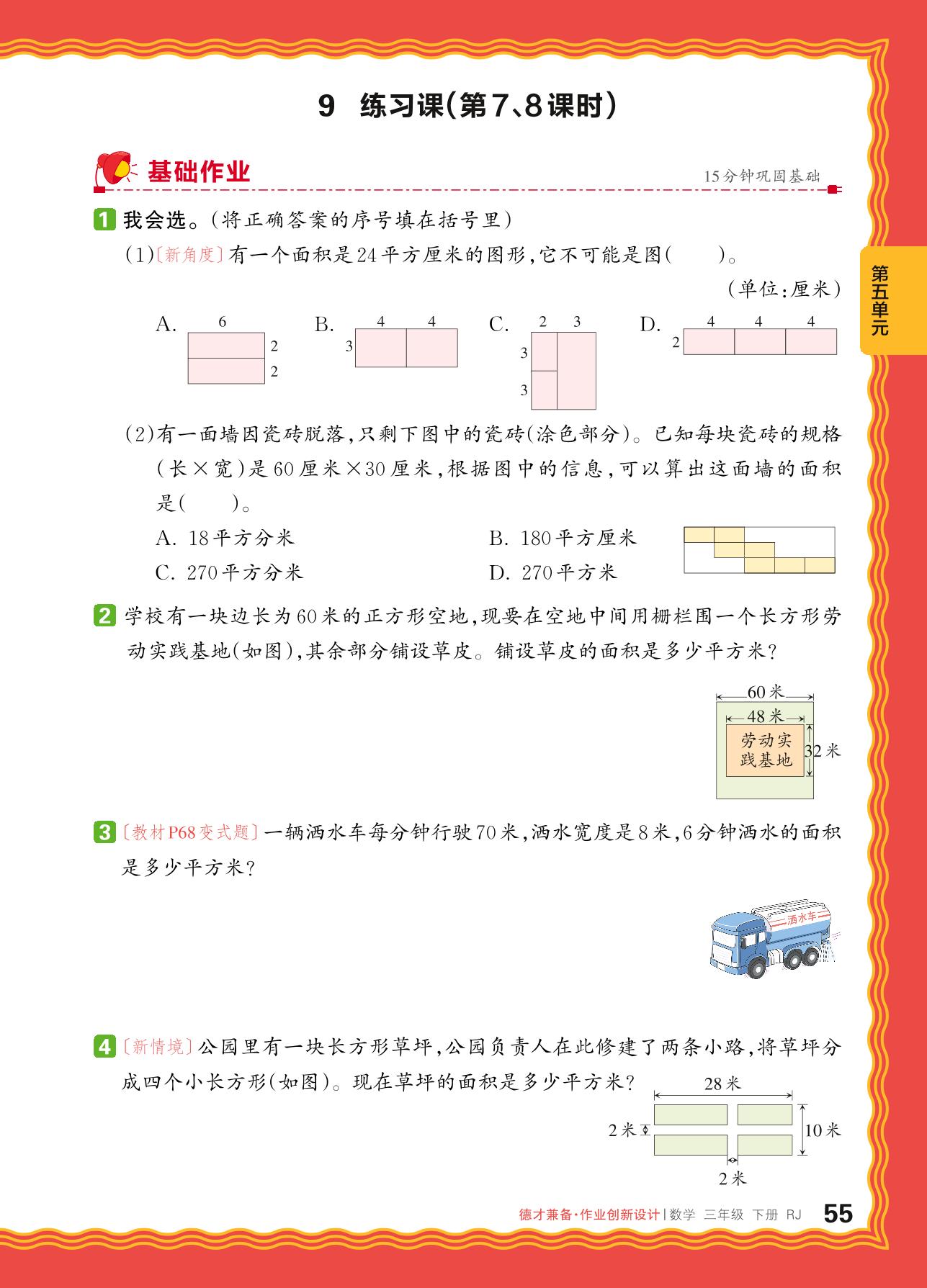2024春下册三年级数学人教版 第五单元 面积——9. 面积单位间的进率 、解决问题练习课