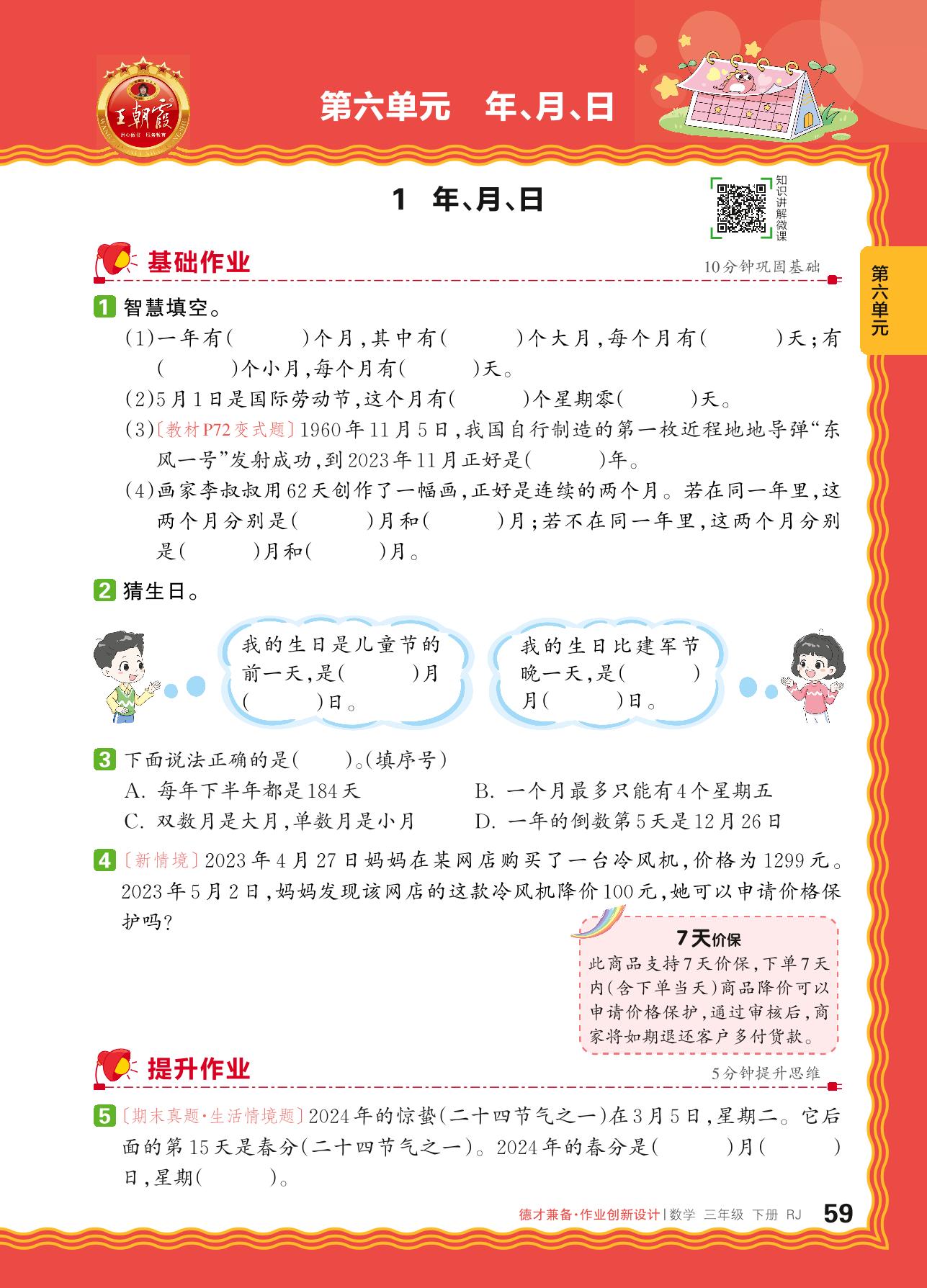 2024春下册三年级数学人教版 第六单元 年、月、日——1. 年、月、日