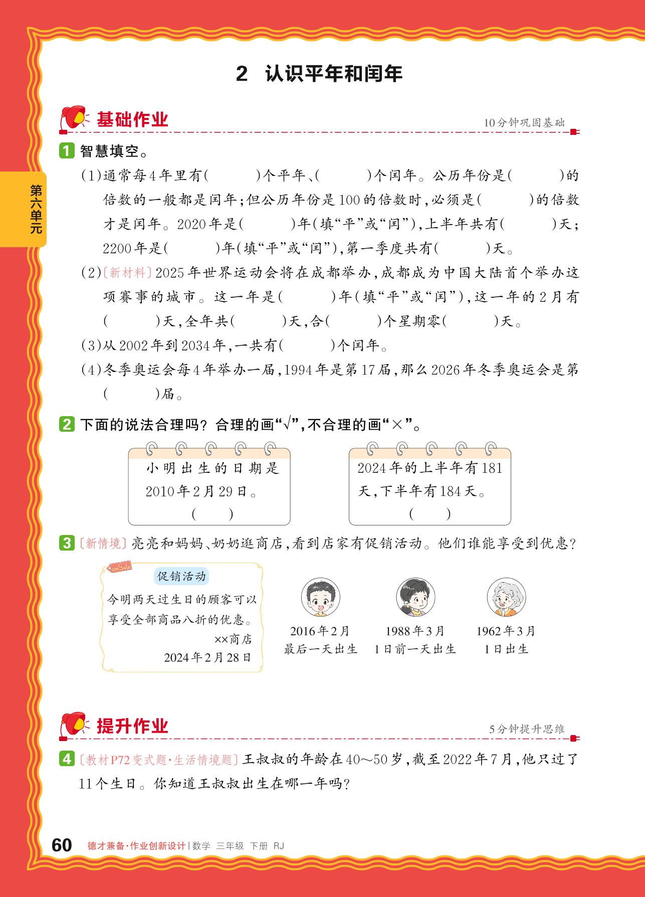 2024春下册三年级数学人教版 第六单元 年、月、日——2. 认识平年和闰年