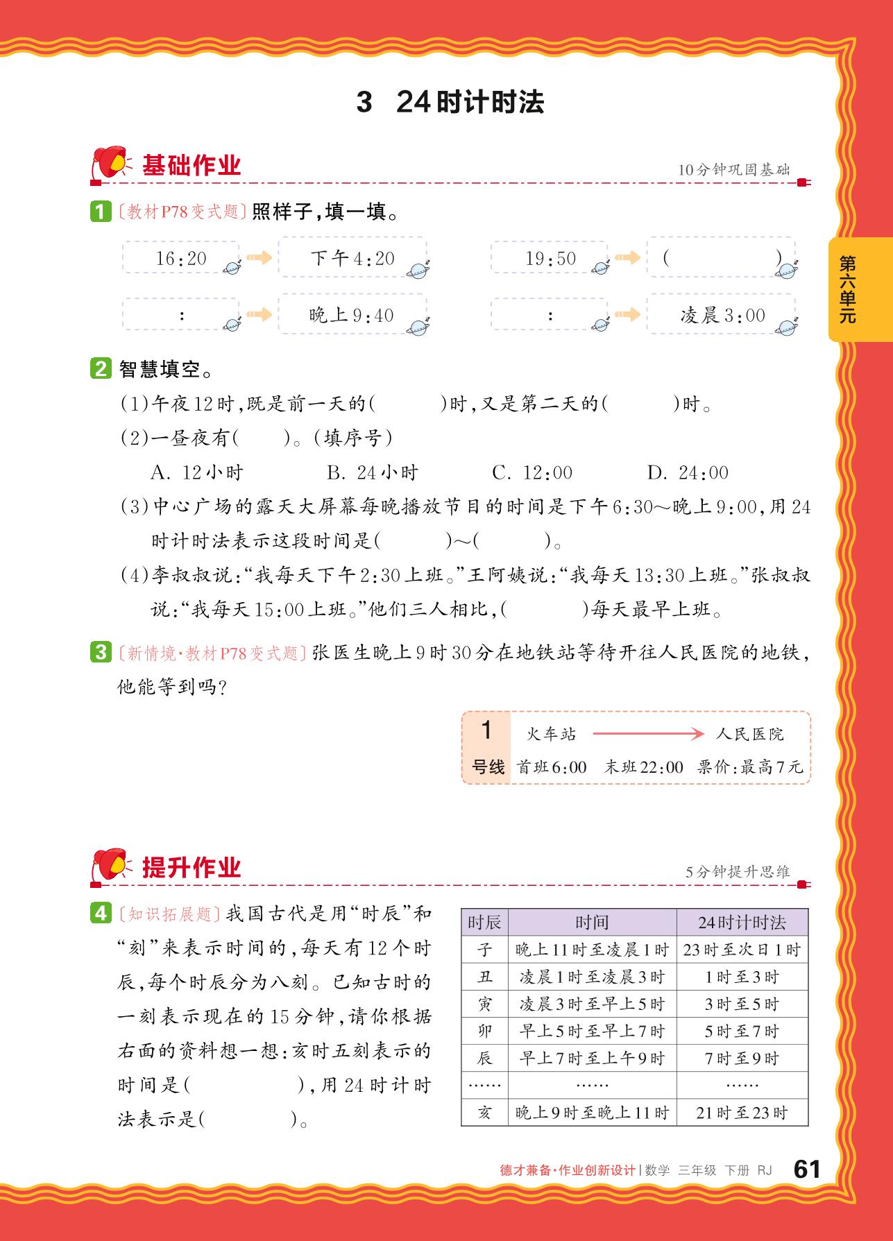 2024春下册三年级数学人教版 第六单元 年、月、日——3. 24时计时法