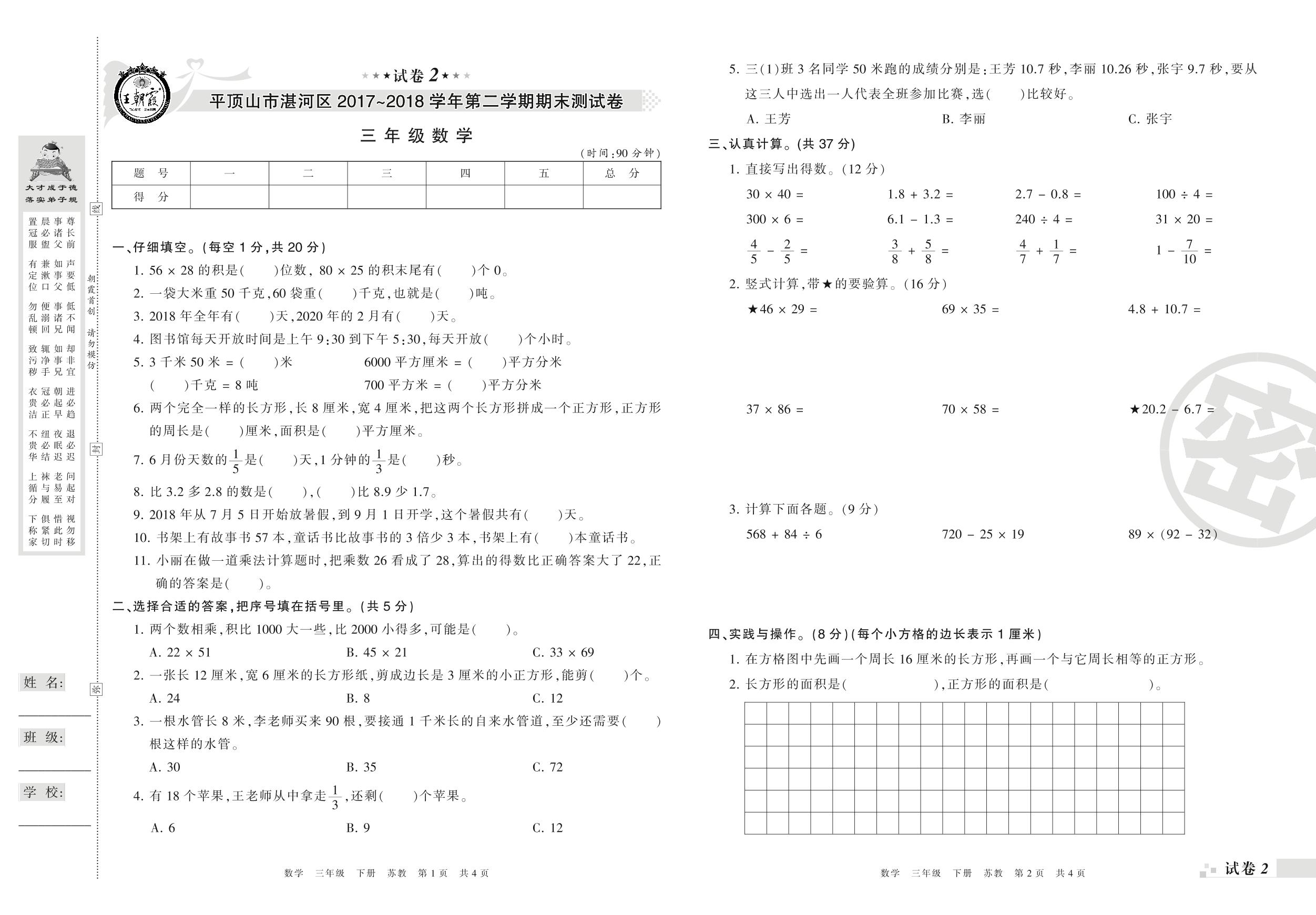 2017-2018学年第二学期平顶山市湛河区三年级数学试卷(苏教版)【2】