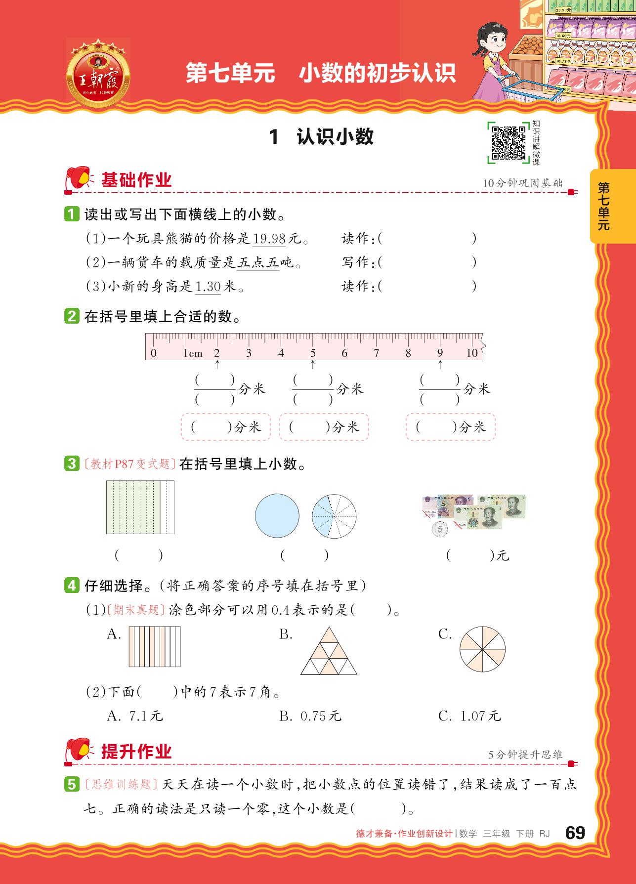 2024春下册三年级数学人教版 第七单元 小数的初步认识——1. 认识小数