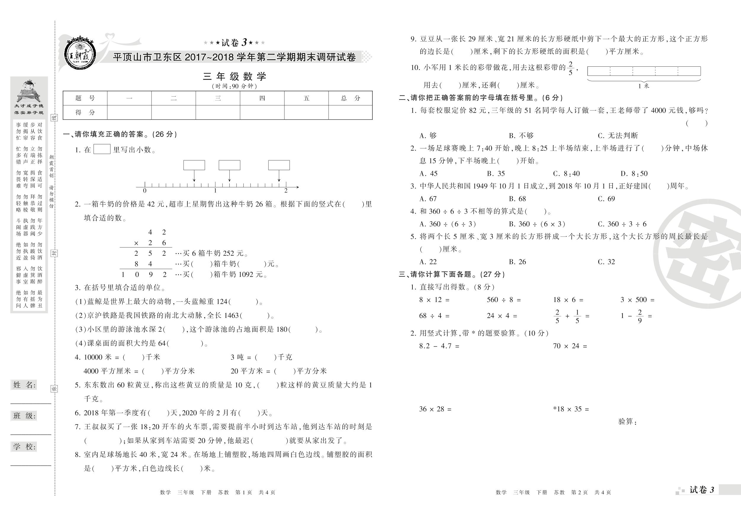 2017-2018学年第二学期平顶山市卫东区三年级数学试卷(苏教版)【3】