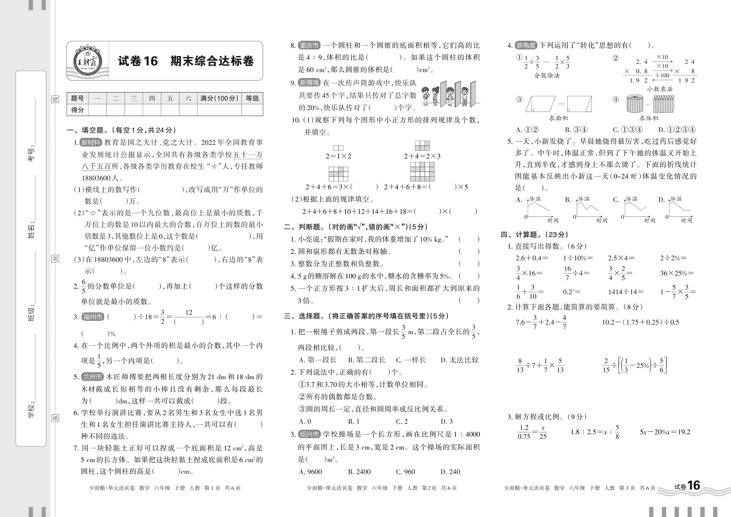 2024春下册六年级数学人教版 期末综合达标卷【16】
