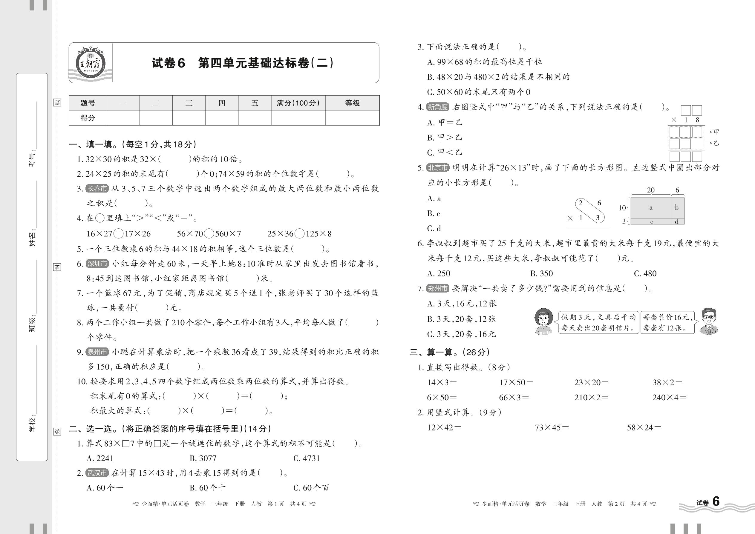2024春下册三年级数学人教版 第四单元基础达标卷(二)【6】