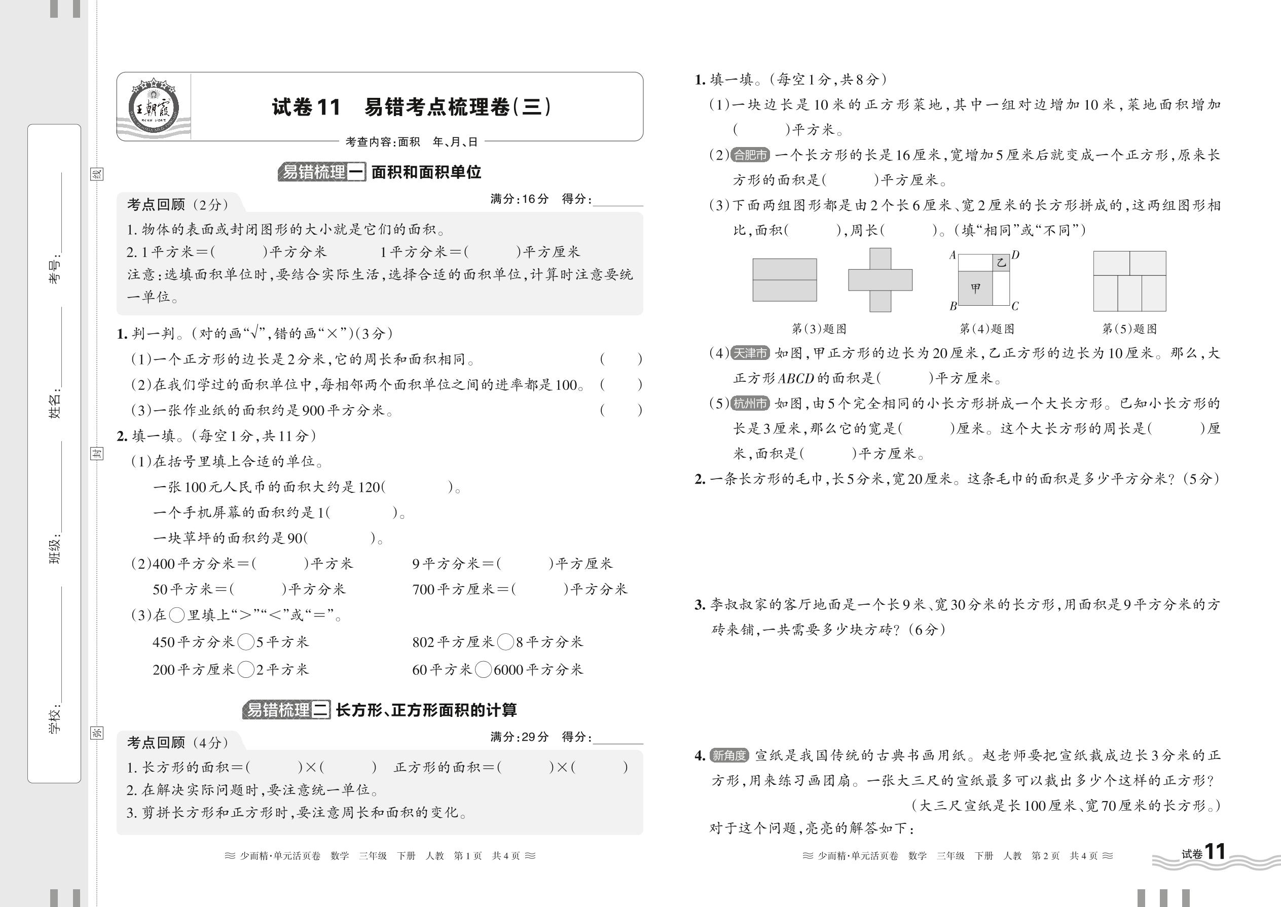 2024春下册三年级数学人教版 易错考点梳理卷(面积 年、月、日)【11】