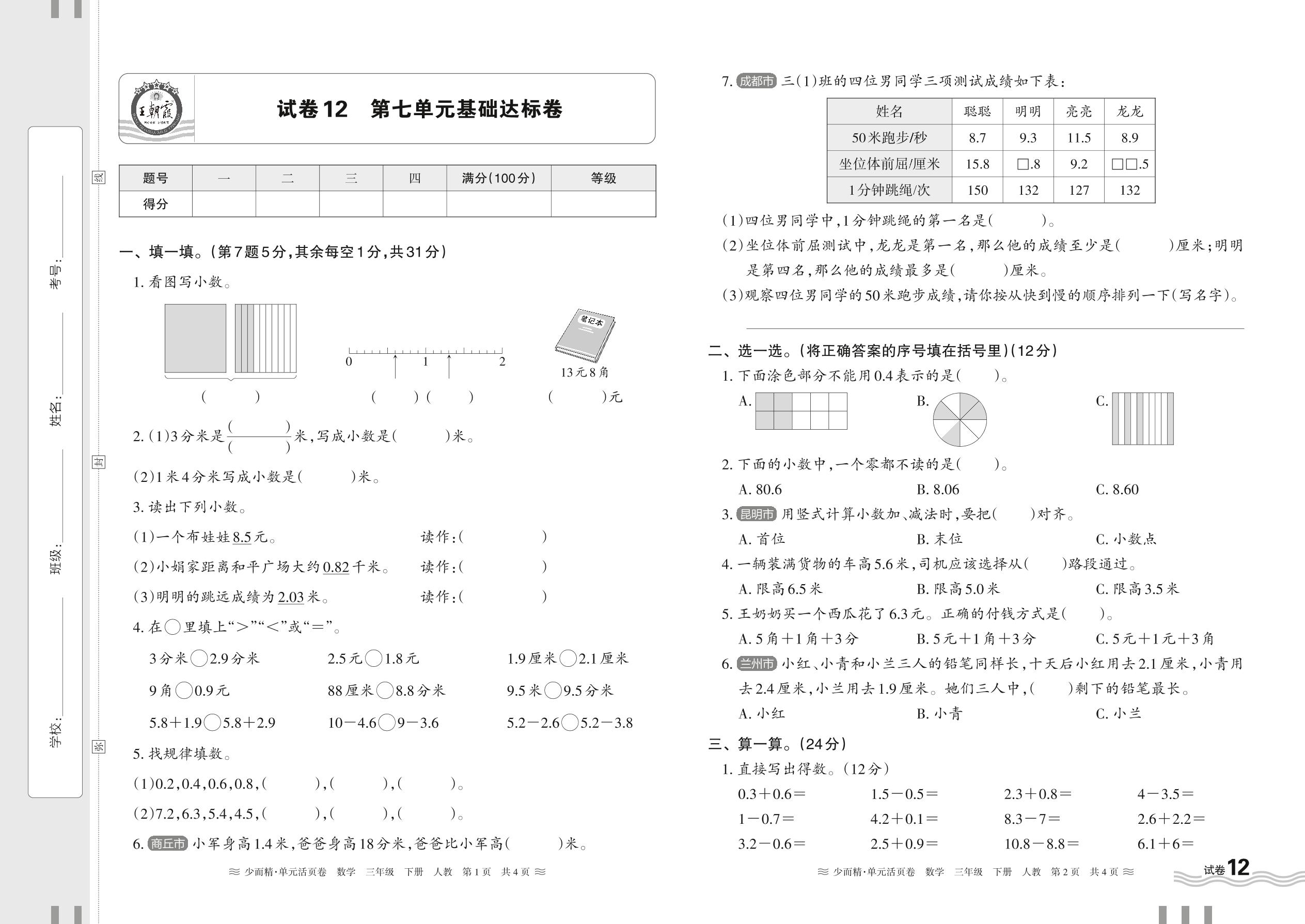 2024春下册三年级数学人教版 第七单元基础达标卷【12】