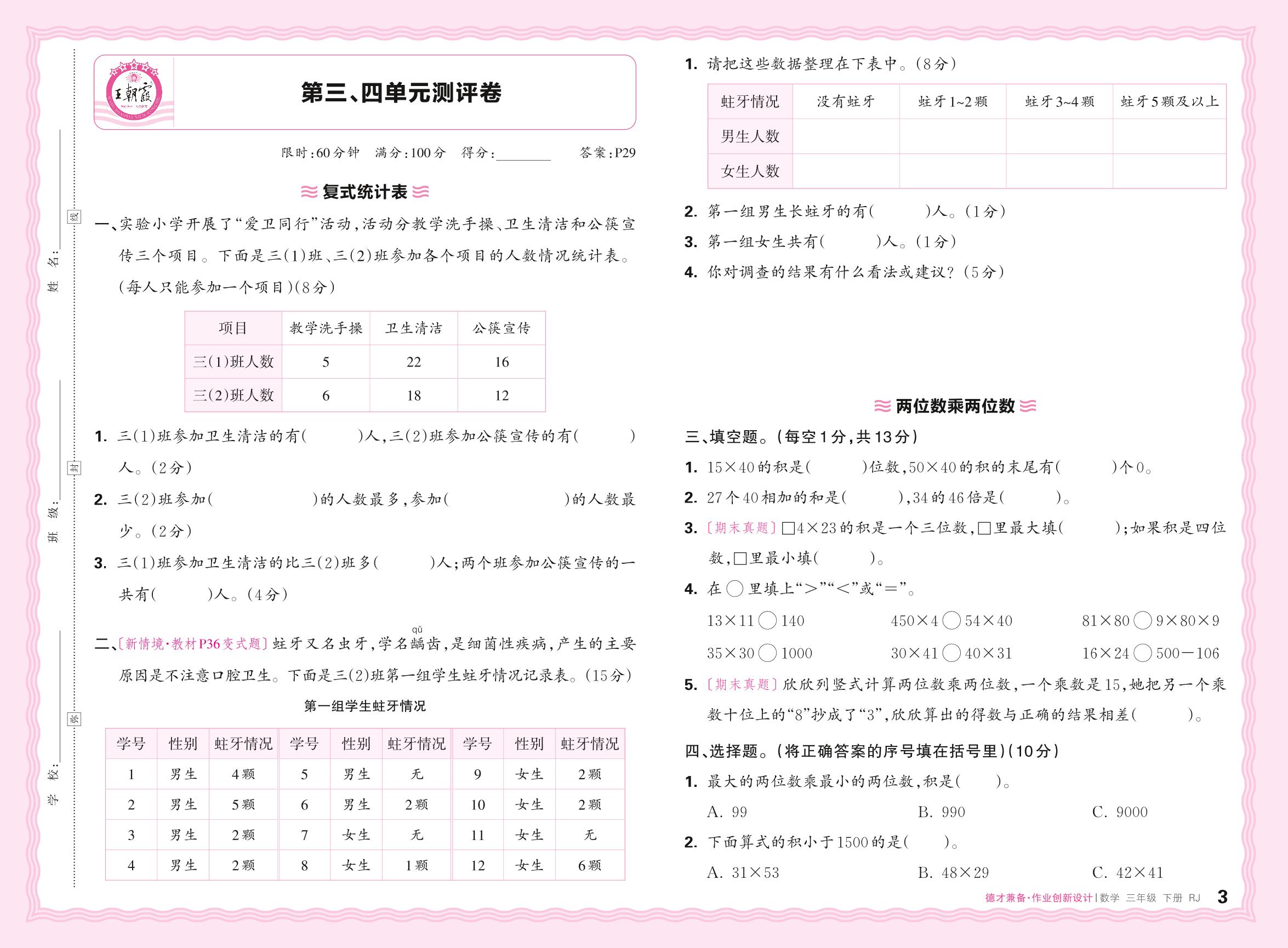 2024春下册三年级数学人教版 第三、四单元测评卷
