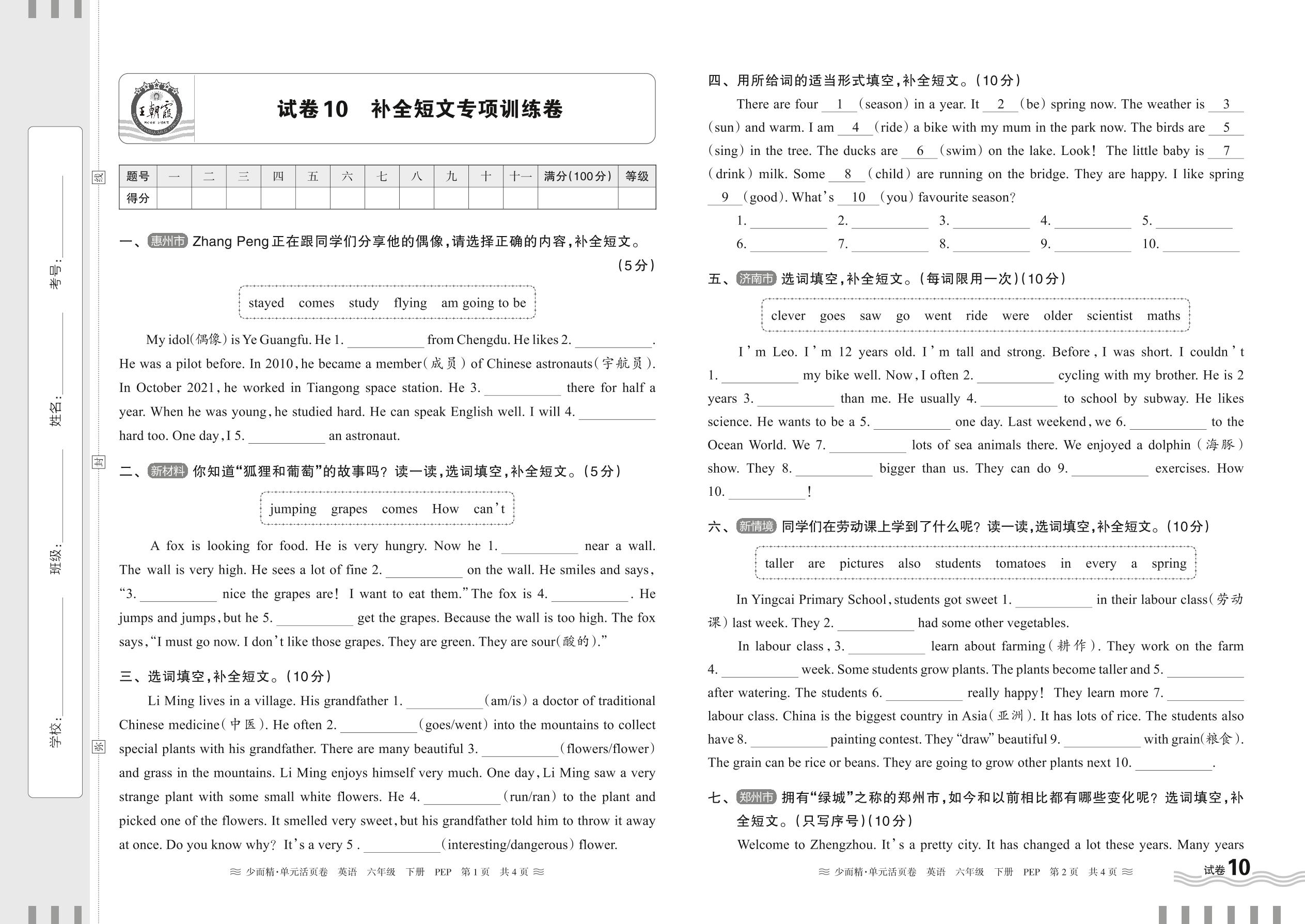 2024春下册六年级英语人教PEP版 补全短文专项训练卷【10】