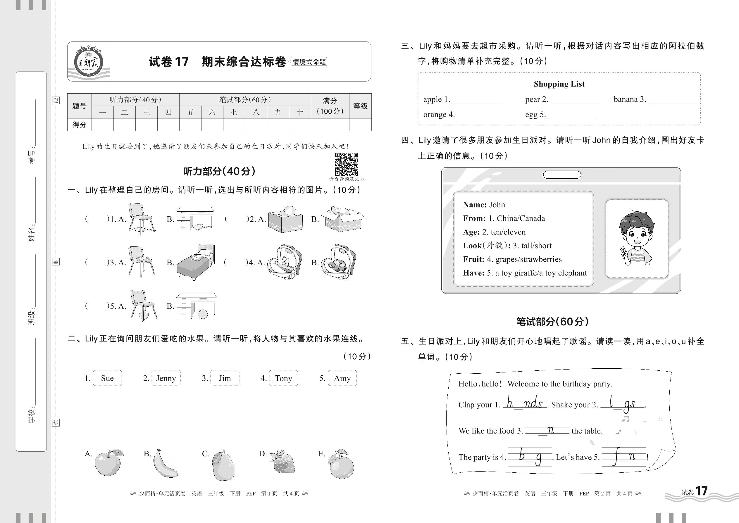2024春下册三年级英语人教PEP版 期末综合达标卷【17】