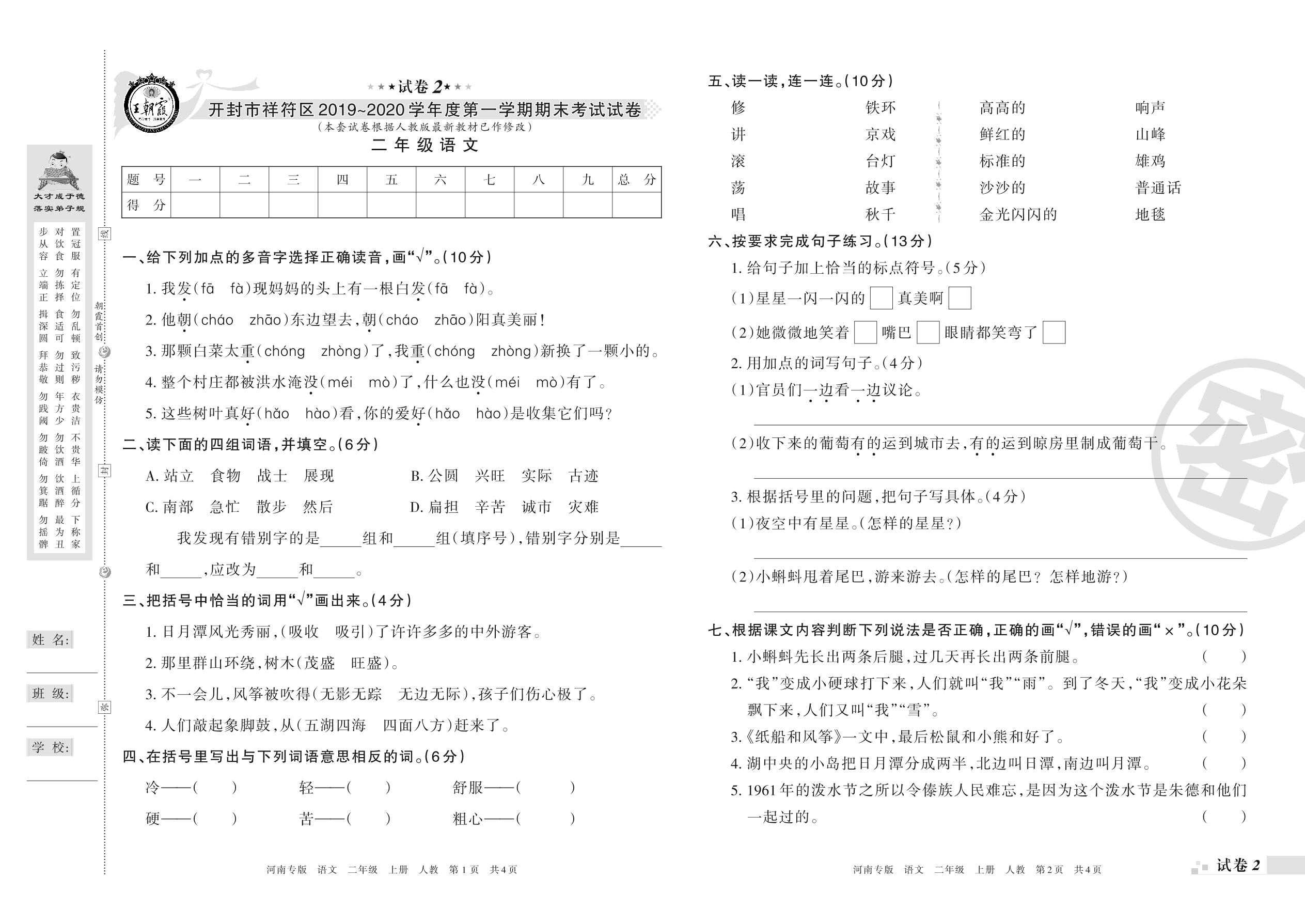 2019-2020学年第一学期开封市祥符区二年级语文试卷(人教版)【2】