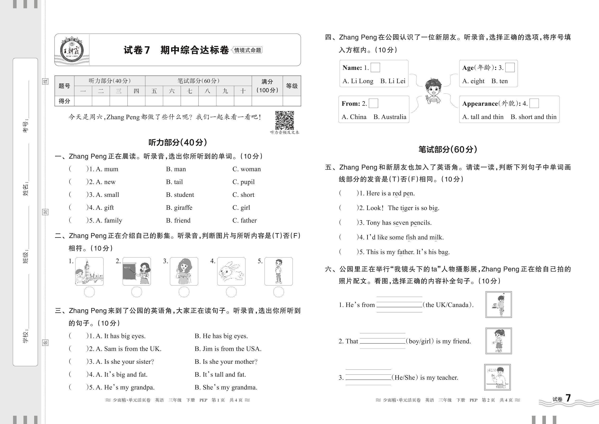 2024春下册三年级英语人教PEP版 期中综合达标卷【7】