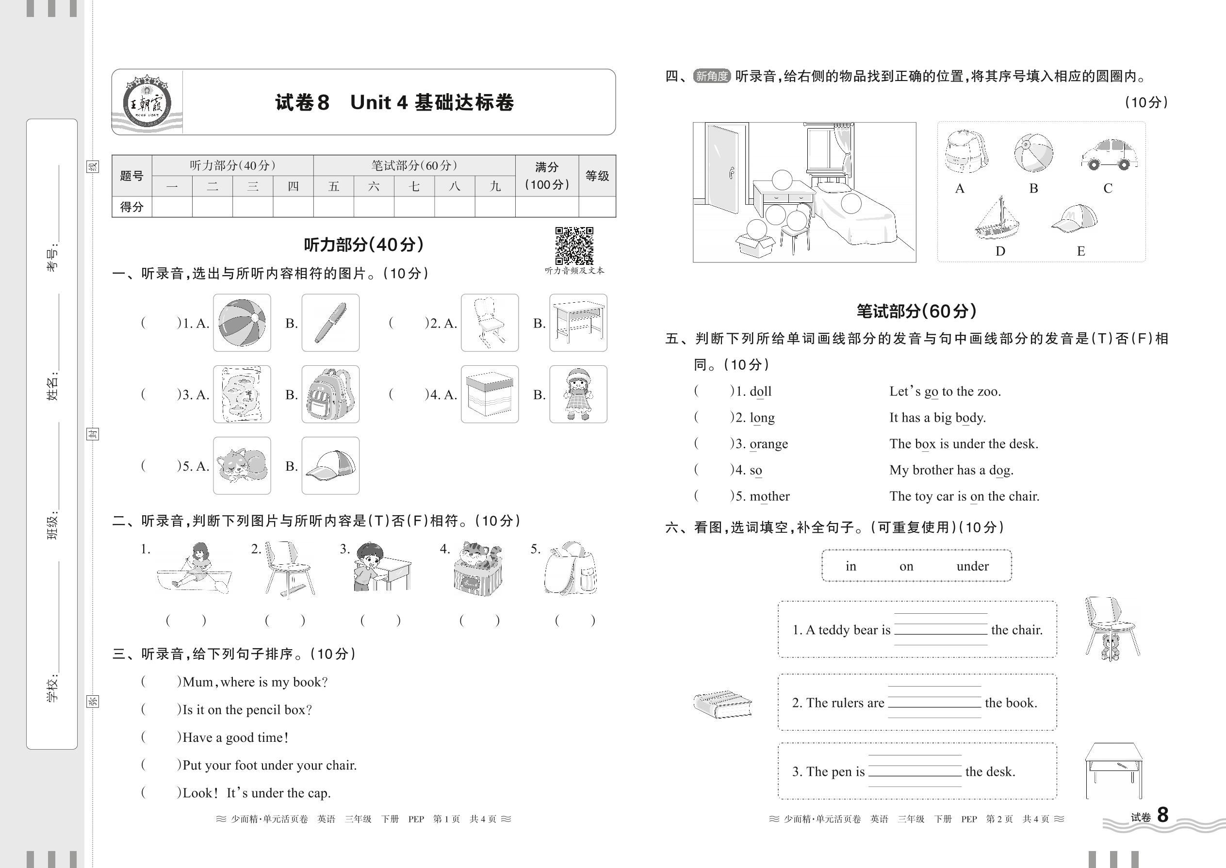 2024春下册三年级英语人教PEP版 Unit 4 基础达标卷【8】