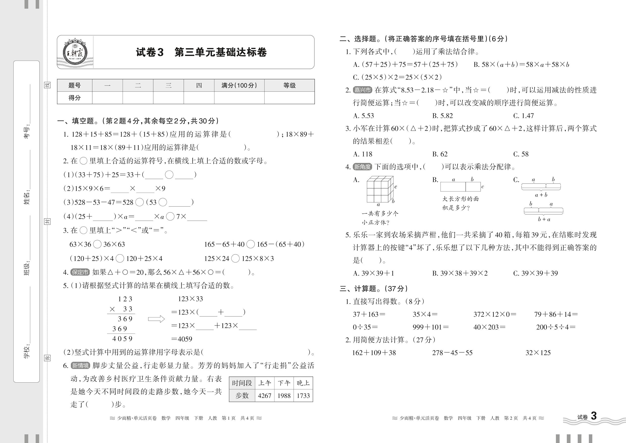 2024春下册四年级数学人教版 第三单元基础达标卷【3】