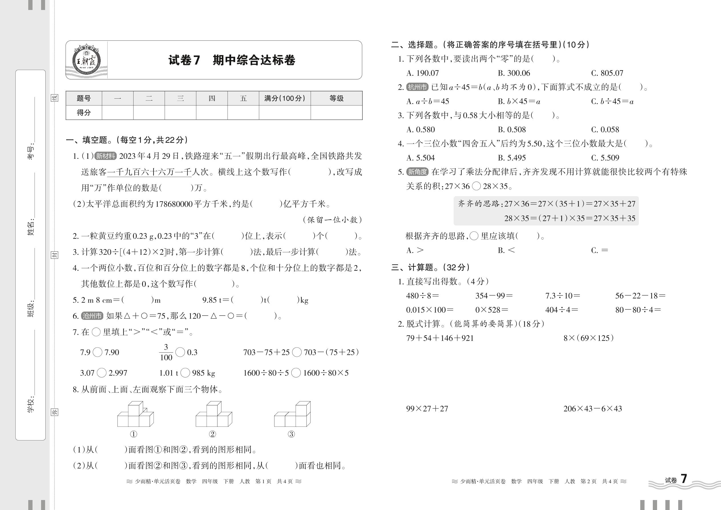 2024春下册四年级数学人教版 期中综合达标卷【7】