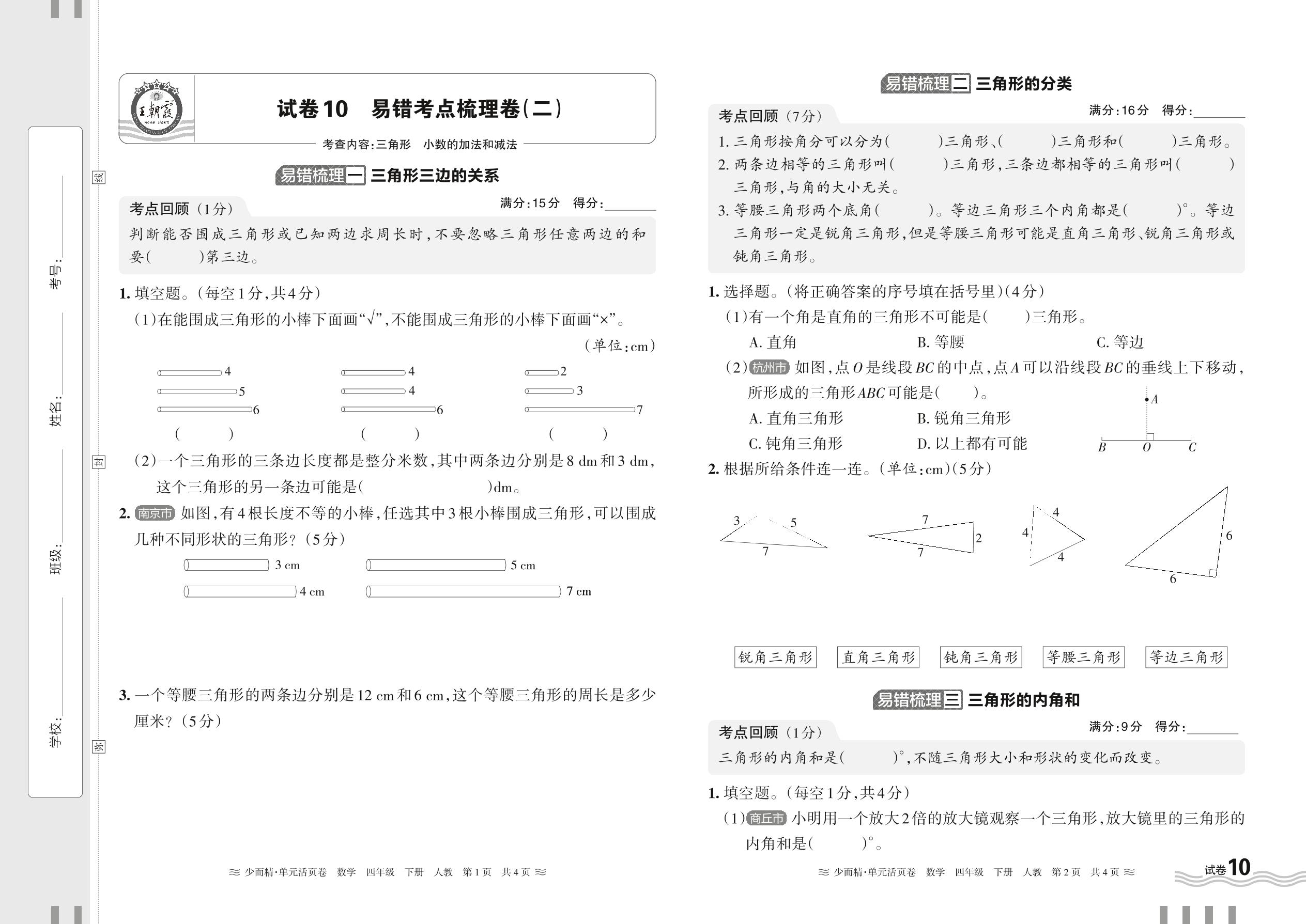 2024春下册四年级数学人教版 易错考点梳理卷(三角形 小数的加法和减法)【10】